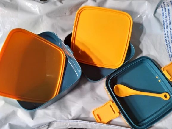 хороший компактный контейнер. пластик, правда, дешёвый. но запаха постороннего нет. заклёпки хорошие, крепкие. ложечка влазит по диагонали под крышку. ну удобнее была бы вилка на мой взгляд. цвет приятный шел долго в Минск, два месяца.