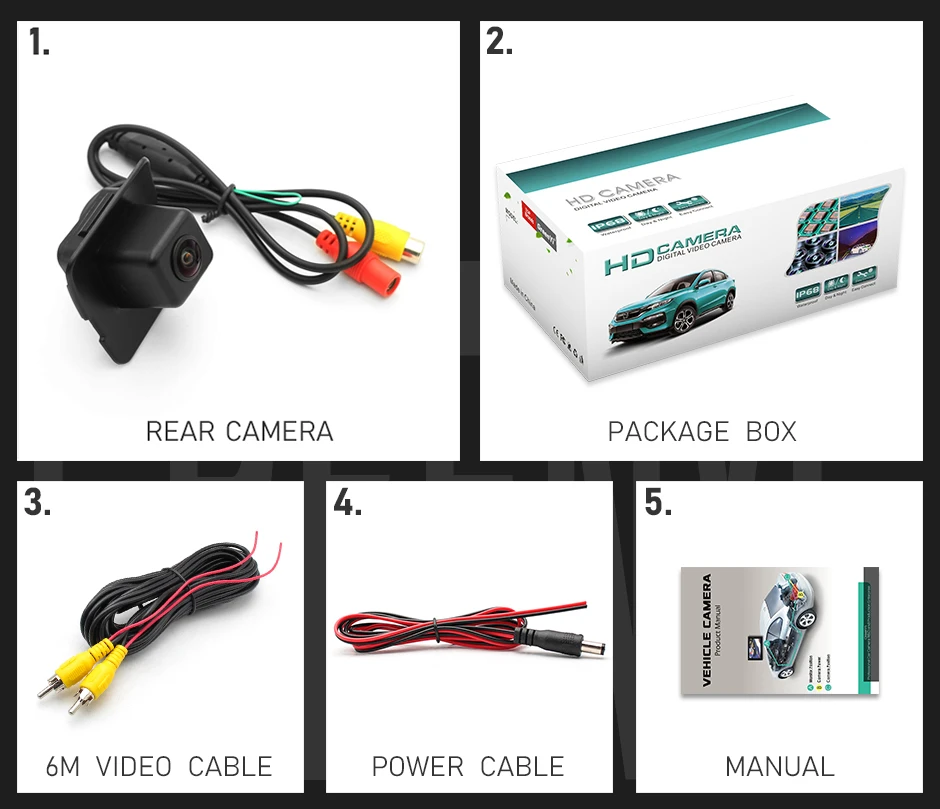 1. Задняя камера2. Коробка для посылка3. Видео кабель (6 м)4. Кабель питания5. Руководство пользователя