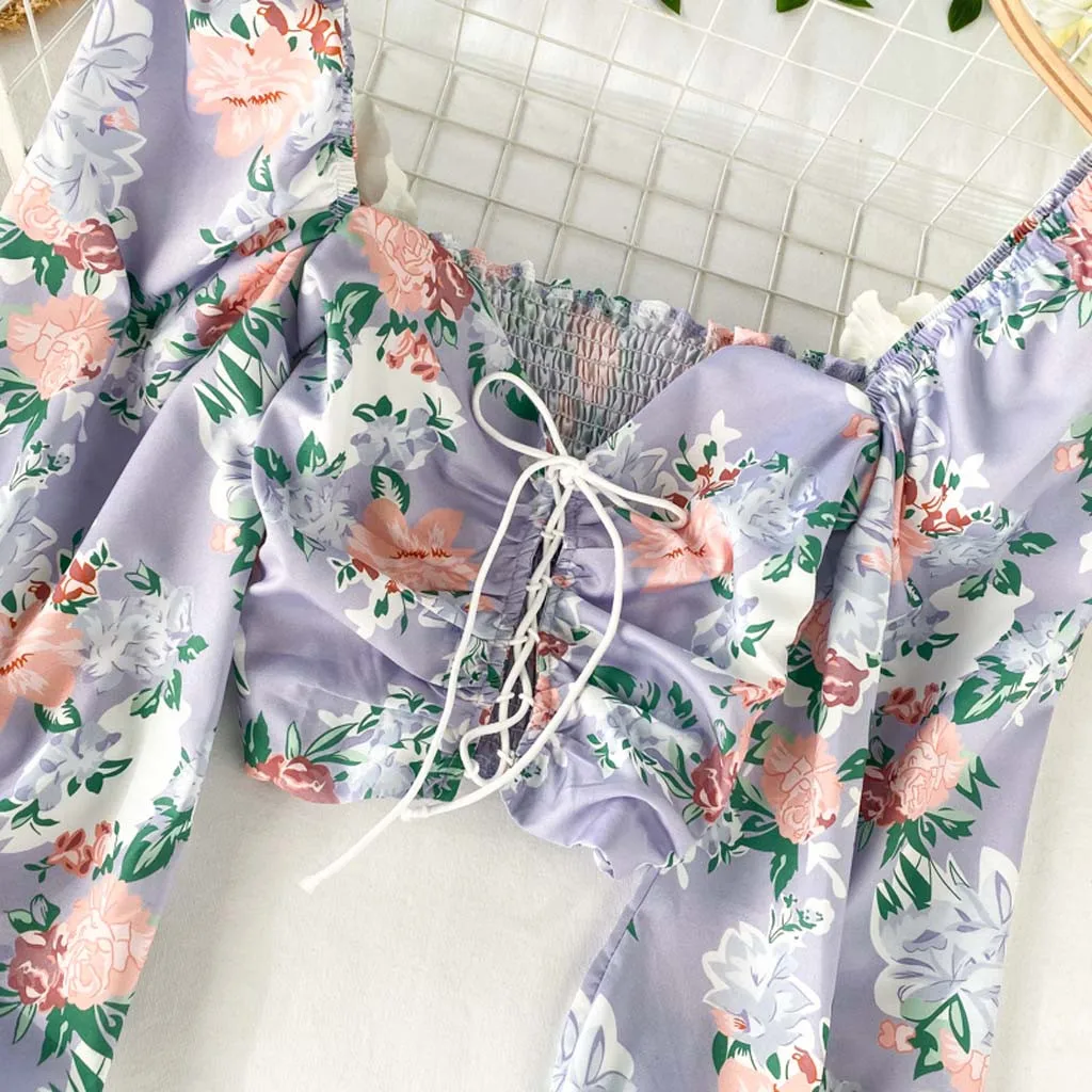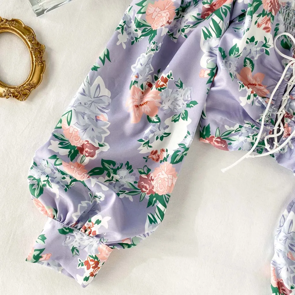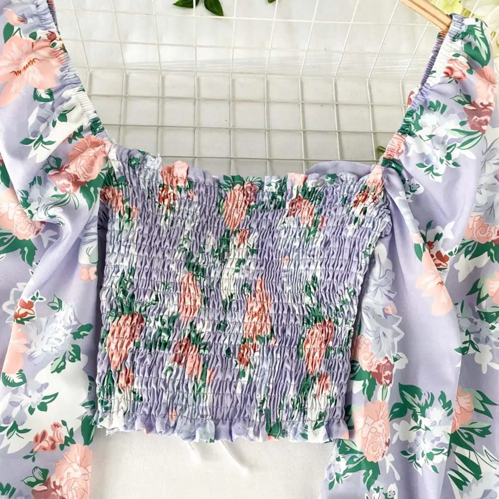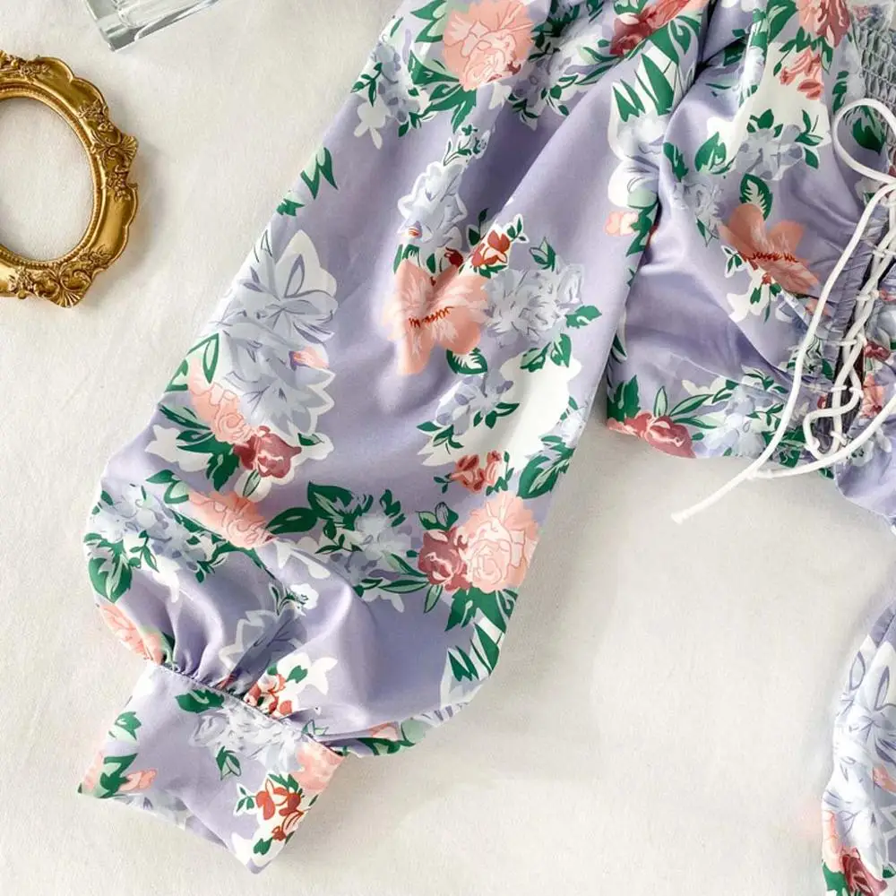 Шикарная шифоновая короткая блузка с цветочным принтом и высокой талией для женщин, Повседневная шифоновая блузка с V-образным вырезом и длинным рукавом