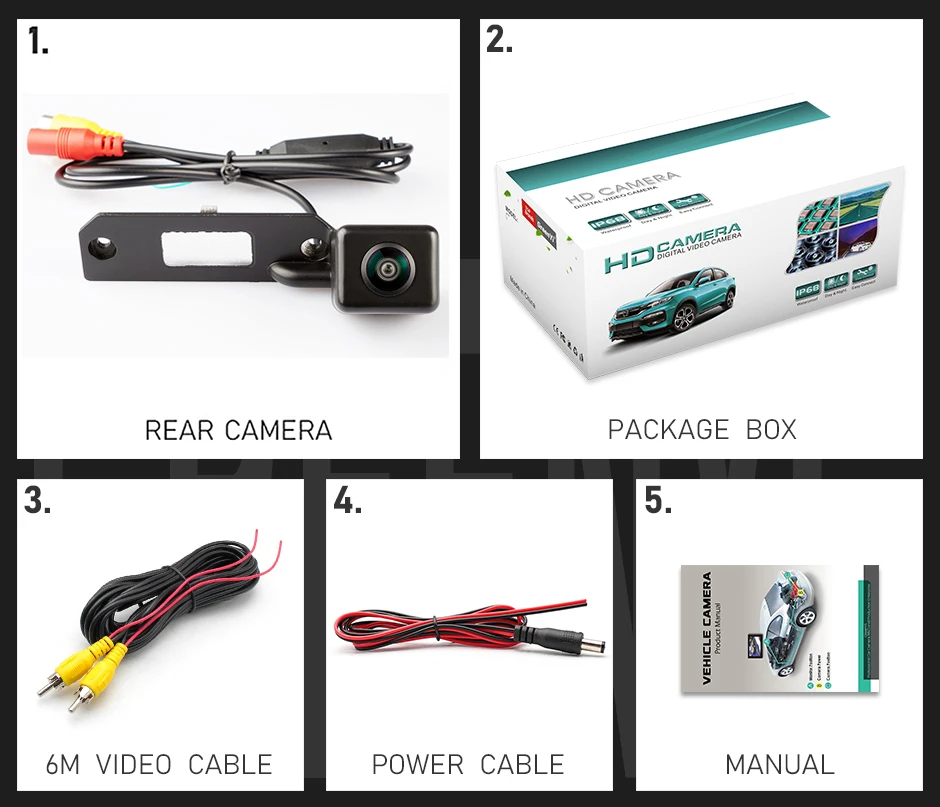 1. Задняя камера2. Коробка для посылка3. Видео кабель (6 м)4. Кабель питания5. Руководство пользователя