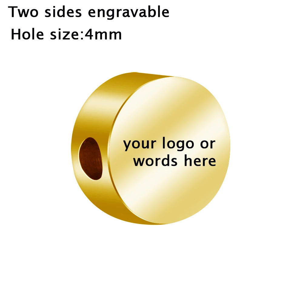 25 шт. в лоте, круглые бусины с логотипом, размер отверстия 15 мм, размер 4 м-гравировка логотипа для вас-индивидуальные бусины для браслета, бусины из нержавеющей стали