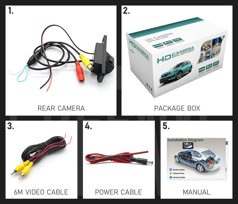 1. Задняя камера2. Коробка для посылка3. Видео кабель (6 м)4. Кабель питания5. Руководство пользователя
