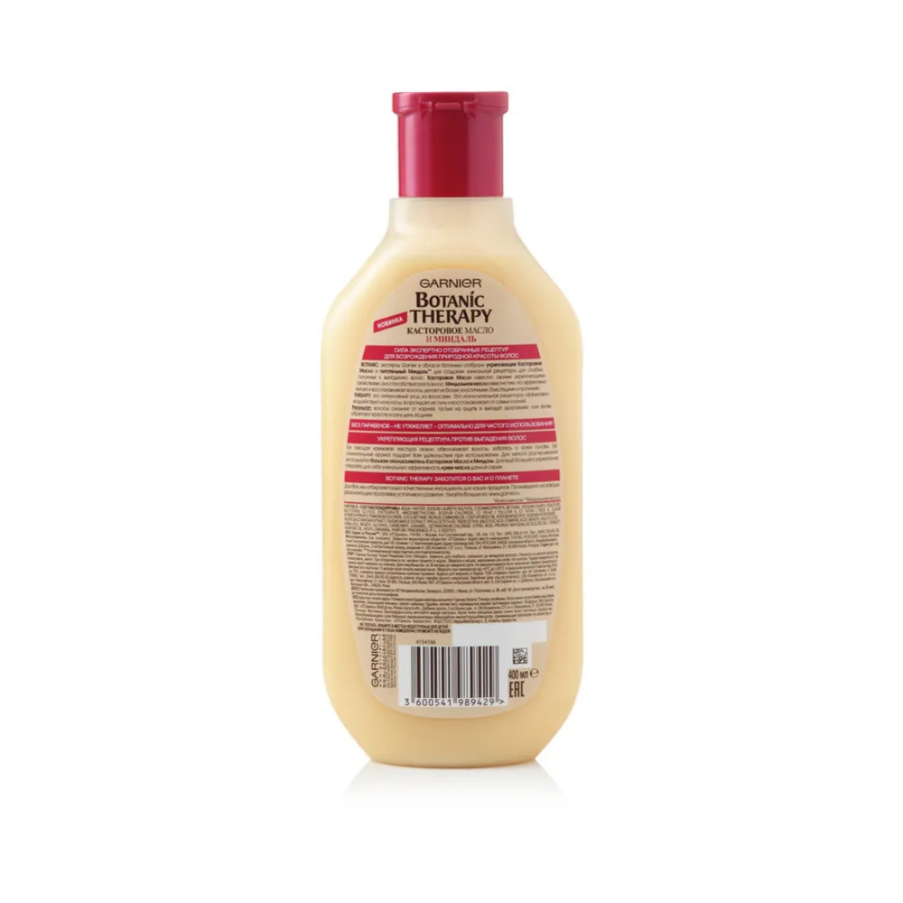 Тип волос: Ослабленные Текстура: Кремообразная Описание от производителя: В состав шампуня Garnier Botanic Therapy входит касторовое масло, укрепляющее волосы и способствующее их росту, и миндальное масло, которое эффективно питает и восстанавливает волосы, делая их более эластичными, блестящими и прочными. Применение: Хорошо намочите волосы от корней до кончиков. Нанесите шампунь, аккуратно массируя кожу головы кончиками пальцев. Тщательно промойте волосы. При попадании в глаза немедленно промойте водой. Состав: Aqua; water, sodium laureth sulfate, cocamidopropyl betaine, sodium lauryl sulfate, glycerin, glycol distearate, amodimethicone, sodium chloride, ci 19140; yellow 5, ci 14700; red 4, guar hydroxypropyltrimonium chloride, coco-betaine, ricinus communis oil; castor seed oil, sodium benzoate, sodium hydroxide, acer saccharum extract; sugar maple extract, ppg-5-ceteth-20, trideceth-6, salicylic acid, fumaric acid, benzyl salicylate, linalool, benzyl alcohol, carbomer, caramel, cetrimonium chloride, citric acid, prunus amygdalus dulcis oil; sweet almond oil, hexyl cinnamal, parfum; fragrance.