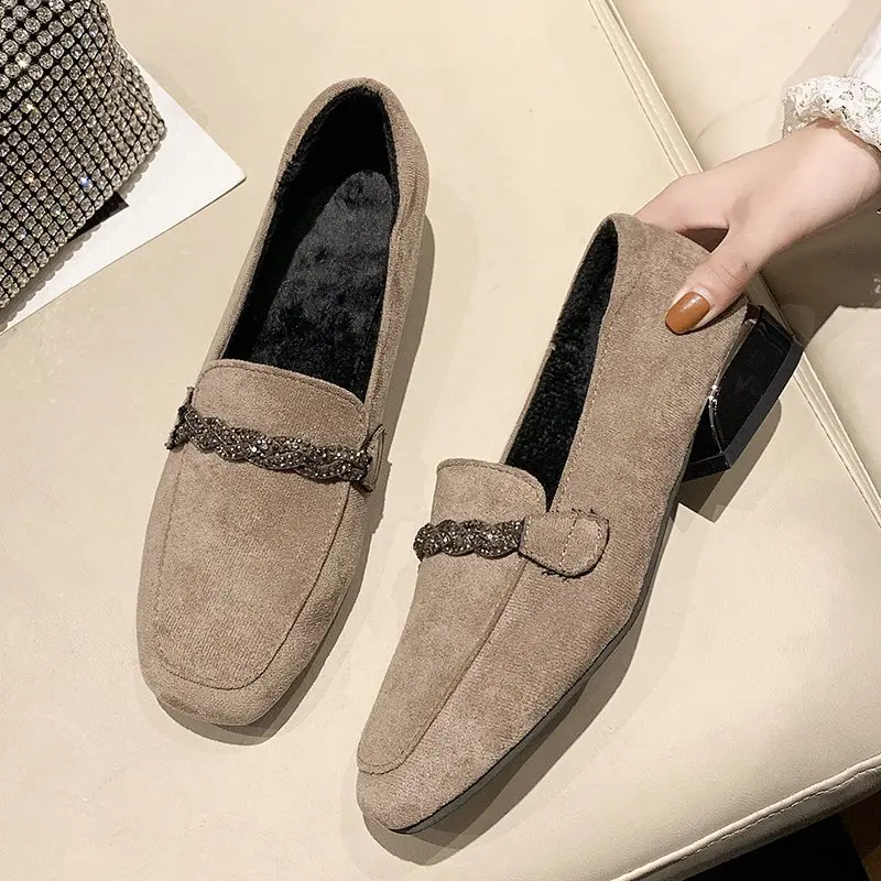2020 осенне-зимние женские лоферы на низком каблуке; Модельные туфли с квадратным носком; Теплая женская обувь из искусственной замши с цепочкой; 8409C