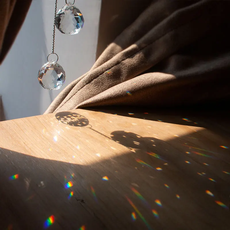 Кристаллы прозрачной призмы соединены с цепочками из бисера, которые имеют красивый эффект, притягивающий светильник; И кристальный солнечный Ловец будет отражать красивый цвет, когда солнце светит на нем, разбрызгивание радужных цветов по всей комнате.