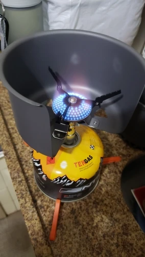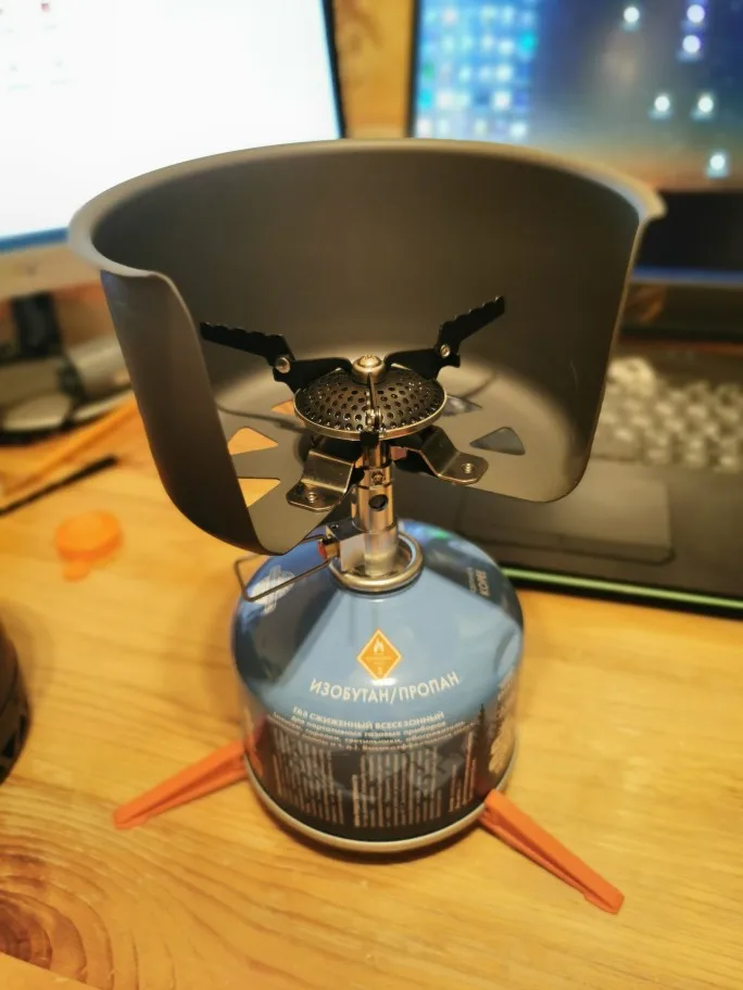Отличный комплект за свою цену. Всё компактно пакуется друг в друга, вес такого мешка вместе с баллоном внутри - 860 грамм. Поллитра воды на минимальном пламени закипает за пять минут ровно. При доставке упаковано все нормально, каждая вещь в своём пакете, для горелки есть отдельный чехол. Сама горелка без пьезоэлемента.