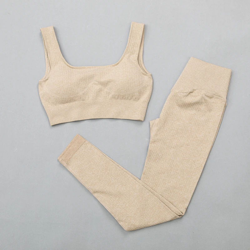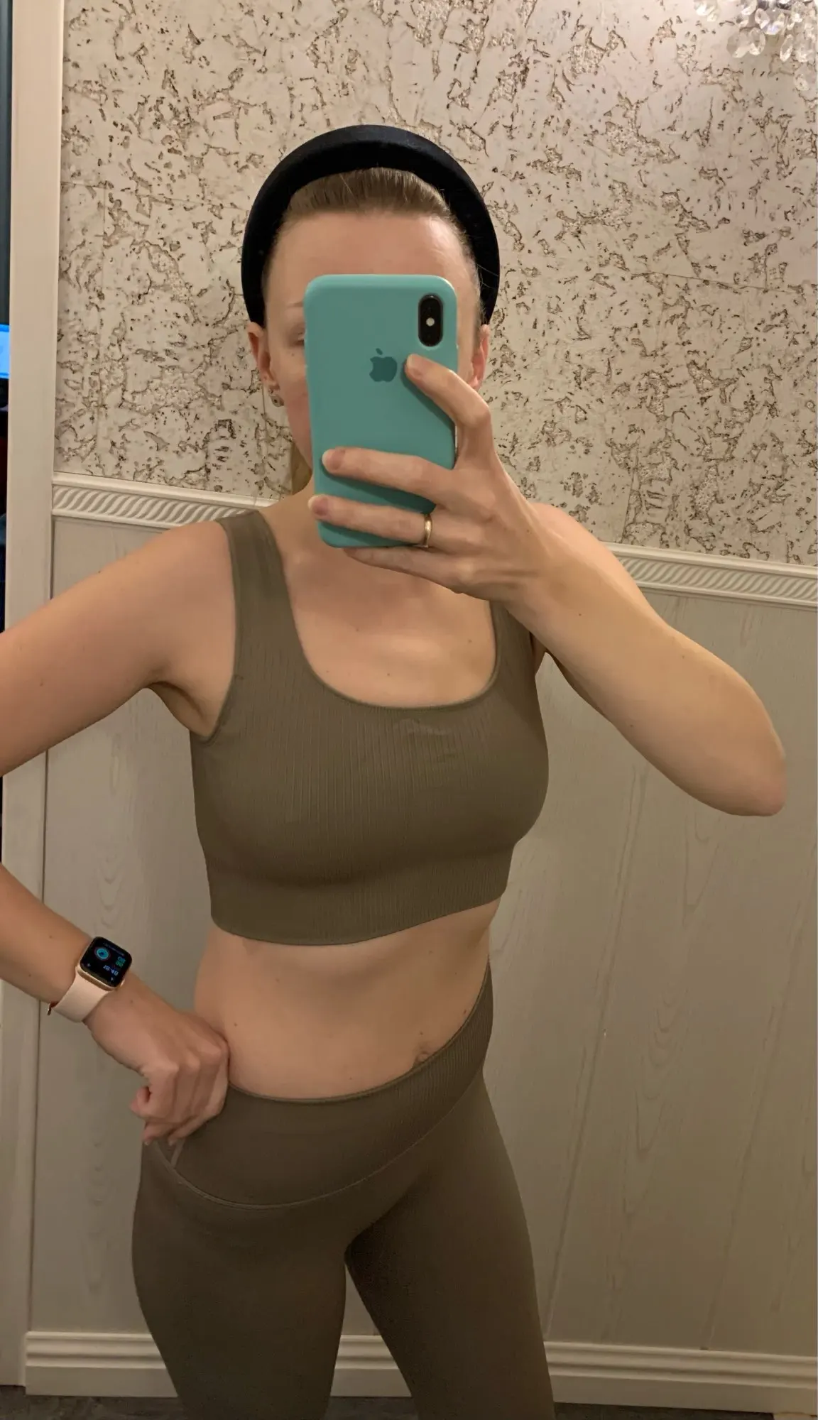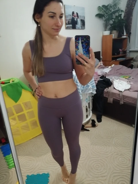 Заказ пришел быстро, продавец молодец. Плотная, жесткая ткань (немного утягивает), но колется и это неприятно. Цвет хаки по факту светло-бежевый, к хаки отношения не имеет, но смотрится хорошо и не просвечивает) Топ супер, на размер 75B сел размер М идеально (внутри чашечки), леггинсы тоже неплохие, но на рост 170 вес 56 хотелось бы чуть длиннее (они по щиколотку, но выше пупка, резинка не топорщится) и не очень красиво смотрятся, т.к.собираются между ног в складку, подчеркивая то, что подчеркивать не нужно). В целом понравился, для занятий дома ок, главное чтобы ткань после стирки перестала колоться. Отдельно заказала бы еще топ в другом цвете - хорошее качество, под пиджак красиво будет смотреться с джинсами с высокой талией.