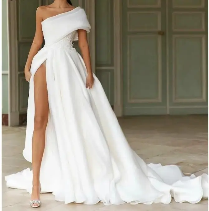 Белое Атласное платье на одно плечо с блестками женское платье со ш...