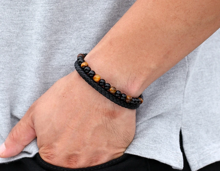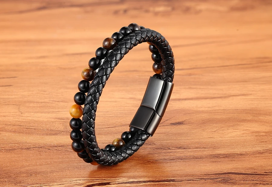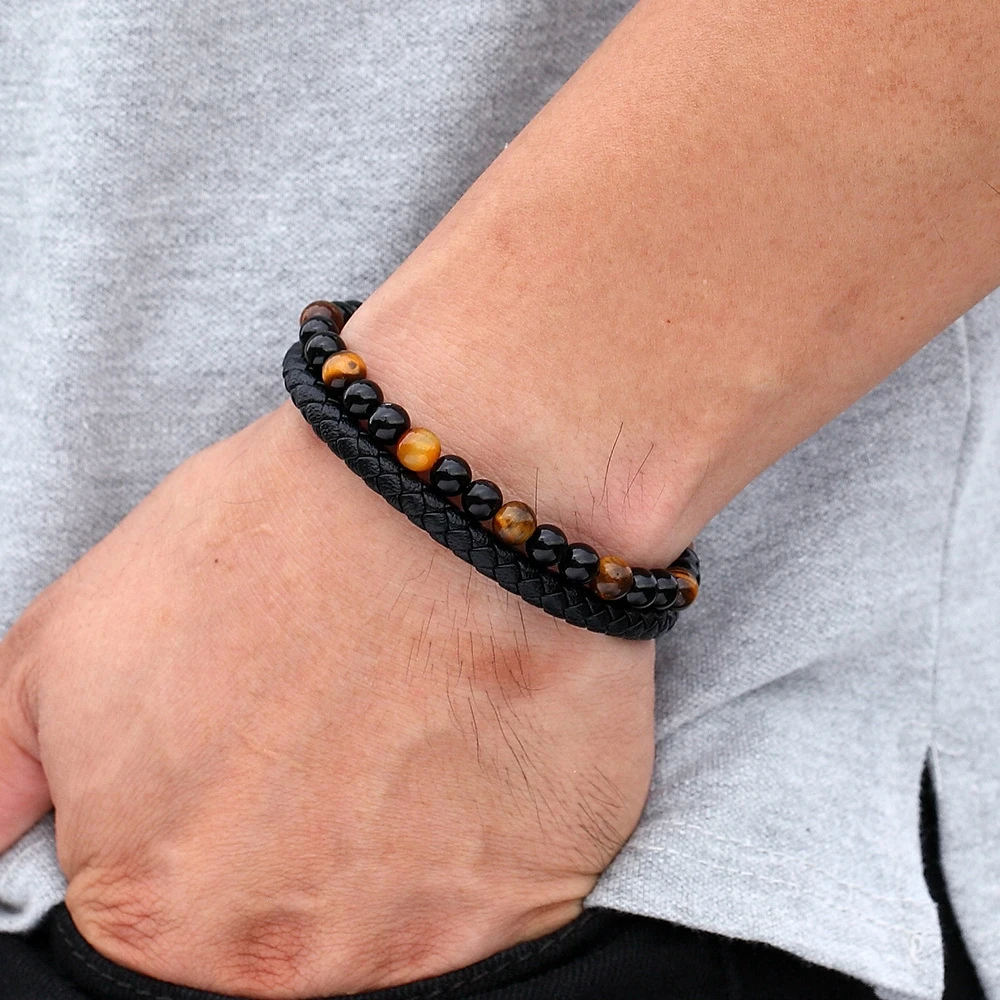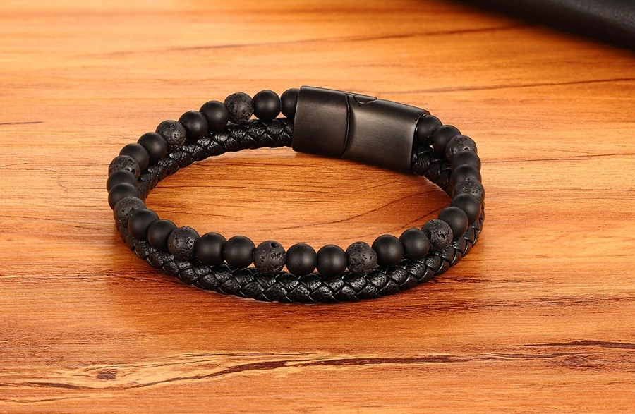 Мужской Двухслойный Кожаный браслет, браслет из натурального камня с магнитной застежкой из нержавеющей стали, ювелирные изделия для мужчин