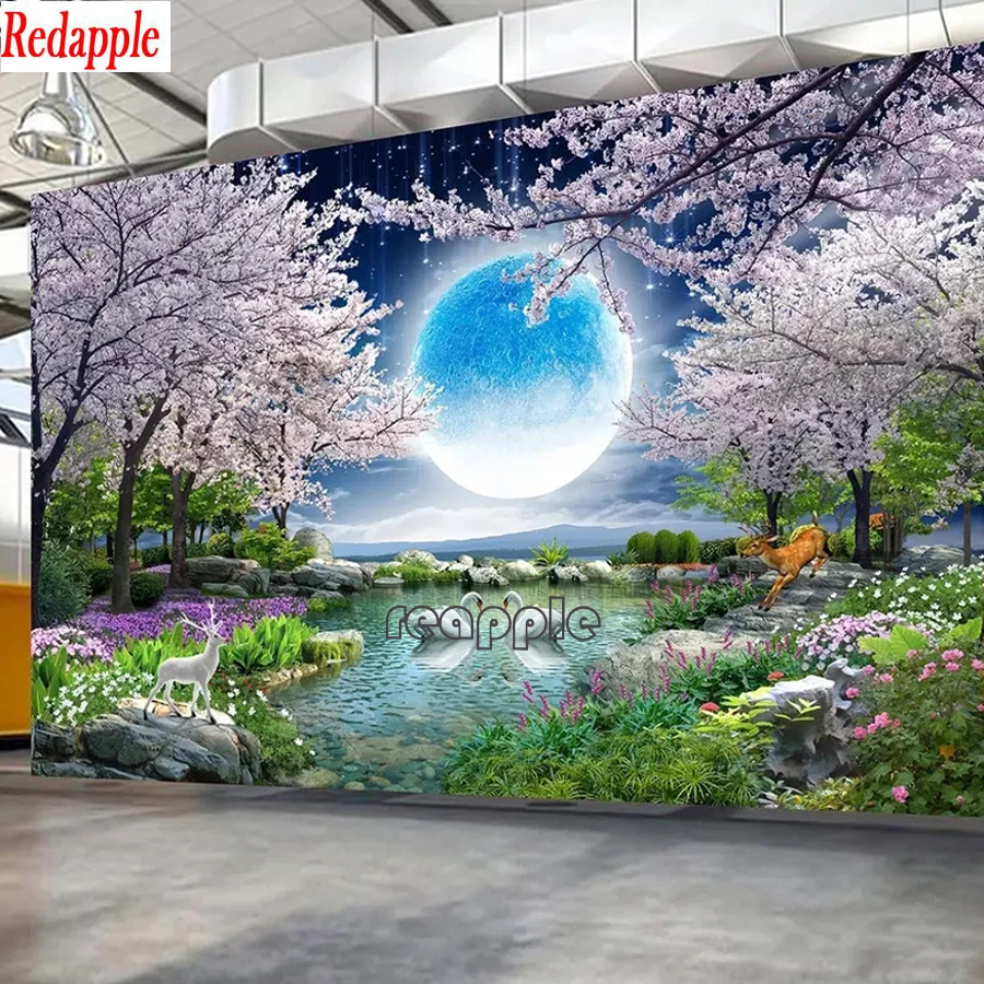 Moon Cherry Blossom Дерево природа пейзаж Сделай Сам Алмазная вышивка, алмаз Европейский полный Алмаз Живопись Вышивка крестом Большой Декор
