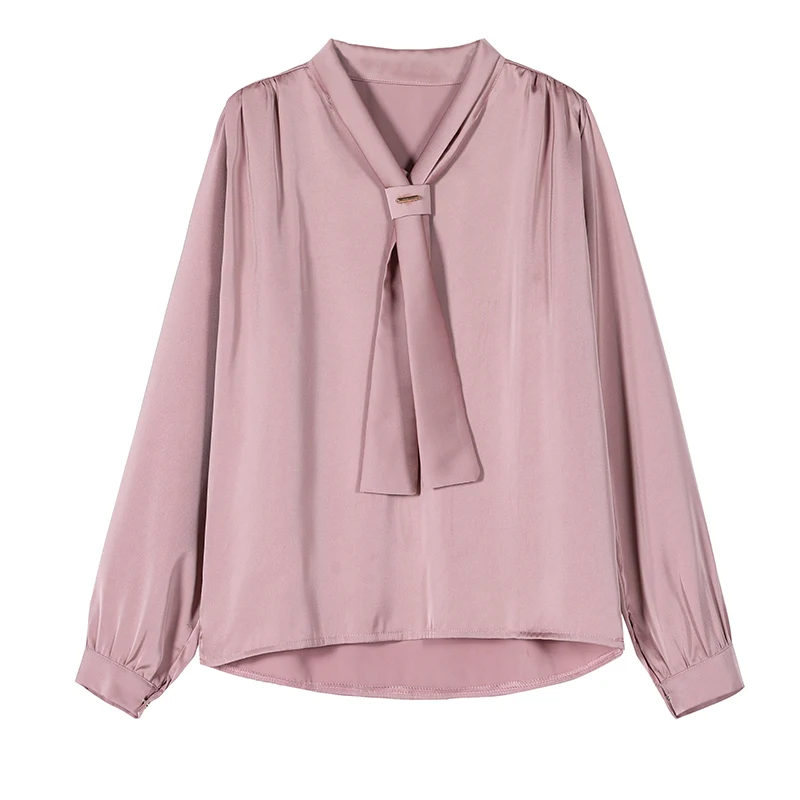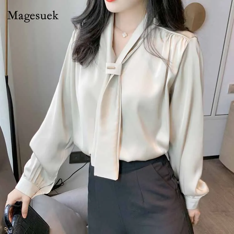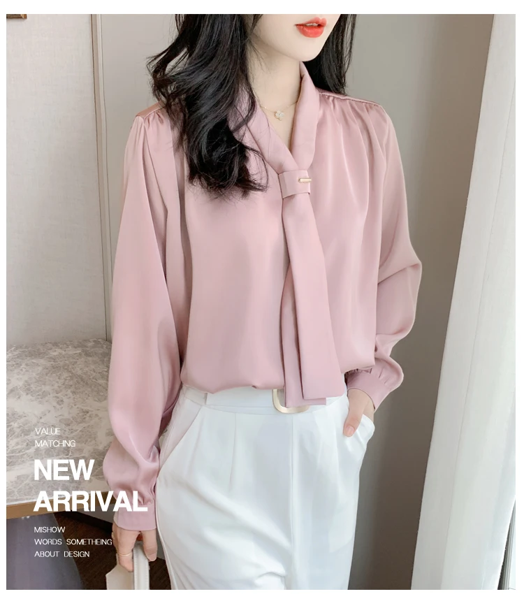 Женская атласная рубашка, Осенние шифоновые Женские топы и блузки, одежда для офиса, женская рубашка с длинным рукавом, Офисная стильная Свободная рубашка с V-образным вырезом, 10842