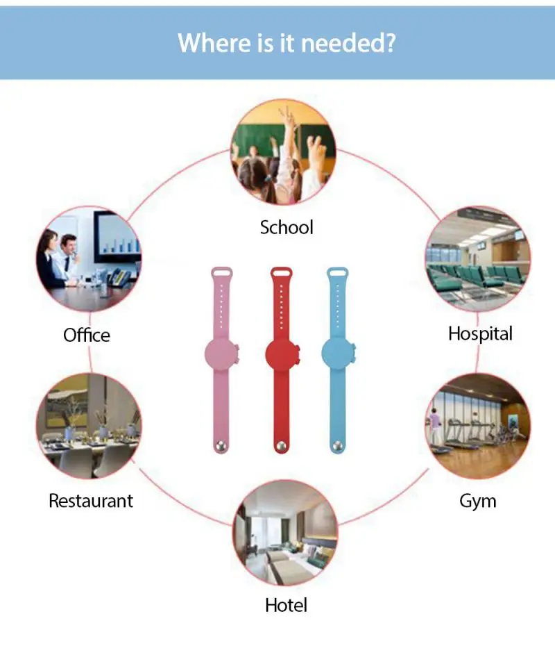 Браслет Biosafety с функцией сделать жизнь людей более практичной и безопасной, позволяя доступ к жидким или гелевым растворам в любое время, всегда доступен под рукой. Для домашнего использования, а также в сочетании с PPE, такими как: дезинфицирующее средство для рук, солнцезащитный крем, репеллент и многое другое.