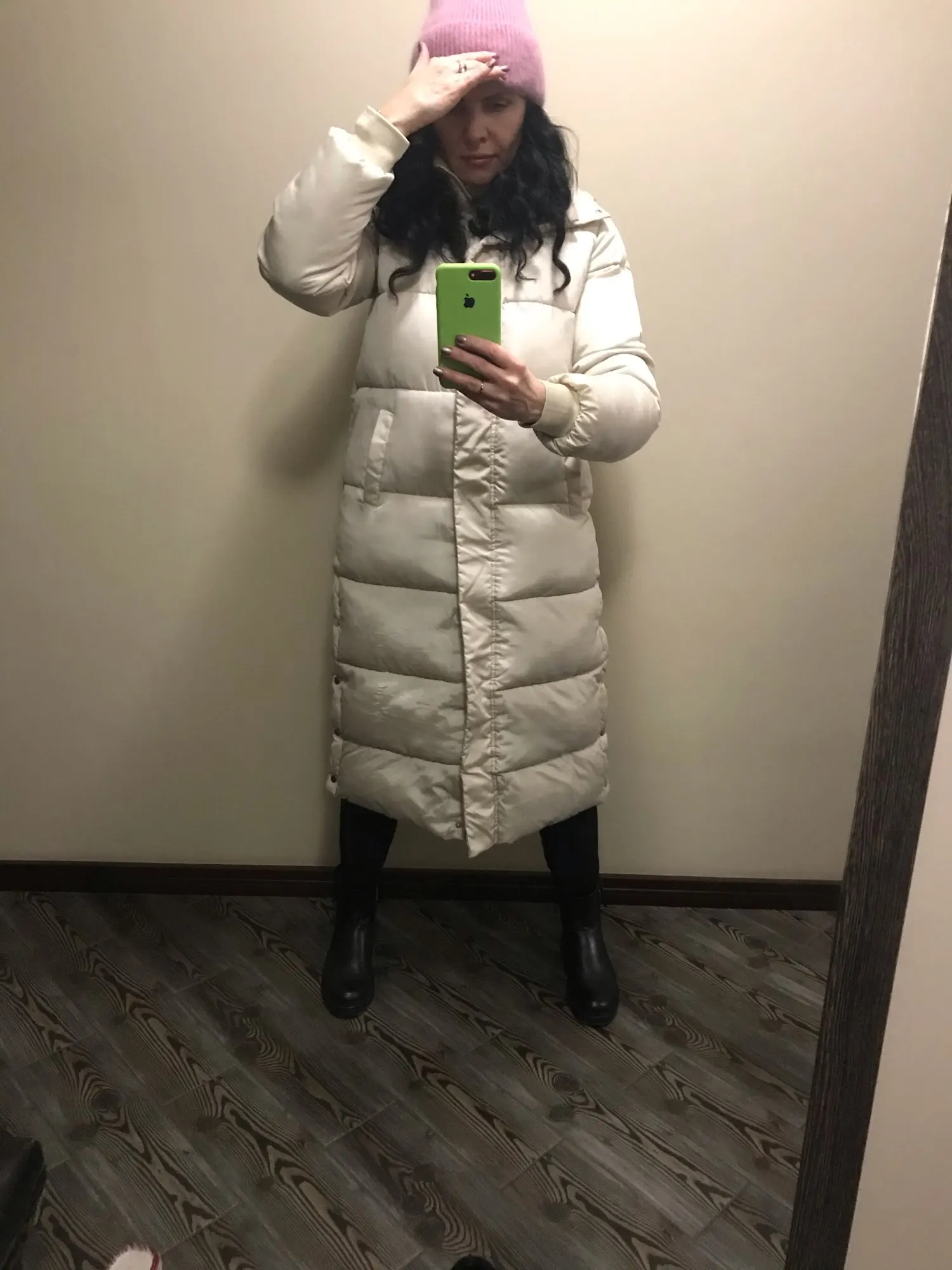Супер. Очень жаркое. Цвет слоновая кость. Лёгкий блеск. Рост 170, 65 кг, грудь 95, бедра 100. Рукав длинны, на свитер на холодную зиму супер. Я люблю немного в обтяжку, поэтому закажу XL или L. Это продам, если не продам оставлю себе. Пальто супер.