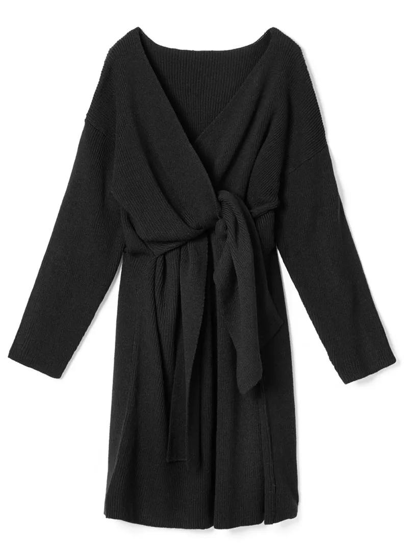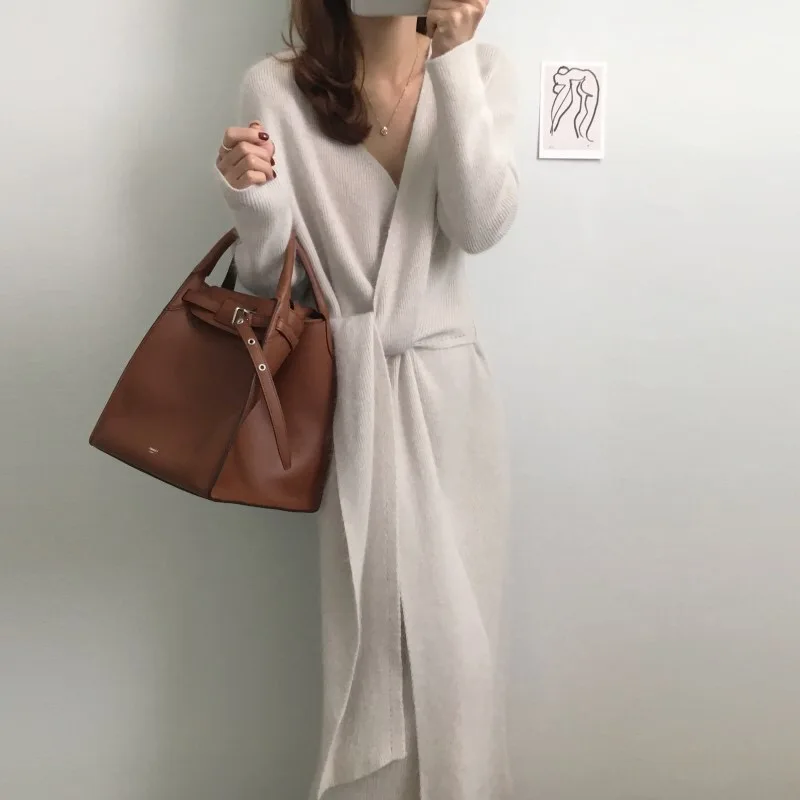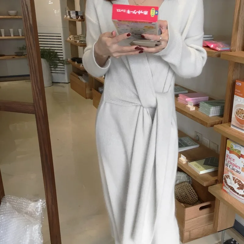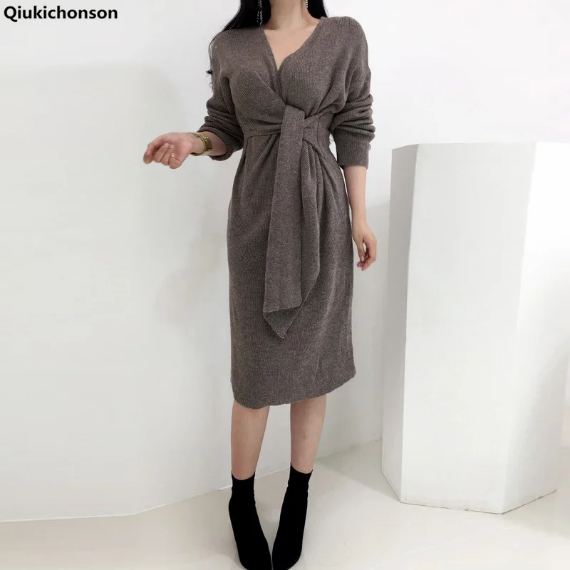 Женское длинное платье с высокой талией, элегантное корейское платье-свитер с V-образным вырезом и перекрестной шнуровкой, Осень-зима 2020