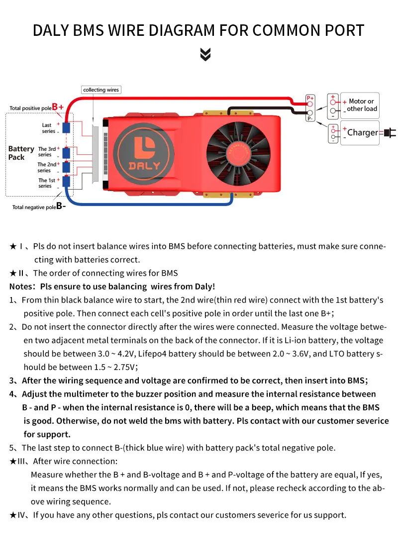 ◆После завершения проводки Измерьте, Равны ли общее напряжение аккумуляторной батареи и общее напряжение, проходящее через BMS. Если они отличаются, проверьте снова в соответствии с вышеуказанной последовательностью проводов.