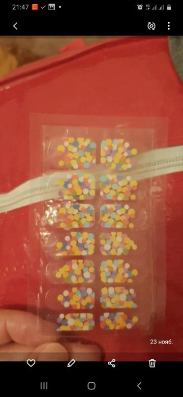 Доставка товара - 3.10-7.12. Всё в целости и сохранности. Покупала за 0.80 рублей в товарах за монеты. О самих наклейках - я их не пробовала, но знаю, что такие хорошо клеятся, при этом ещё и на практически любой однотонный фон, блестят как фольга. Так же к плюсам можно отнести 7 размеров. Заказом довольна.
