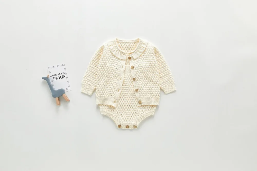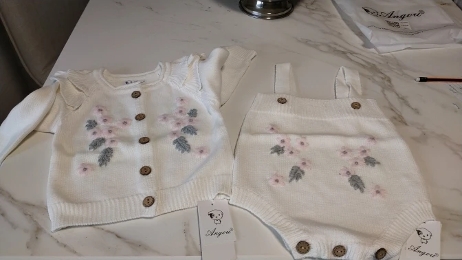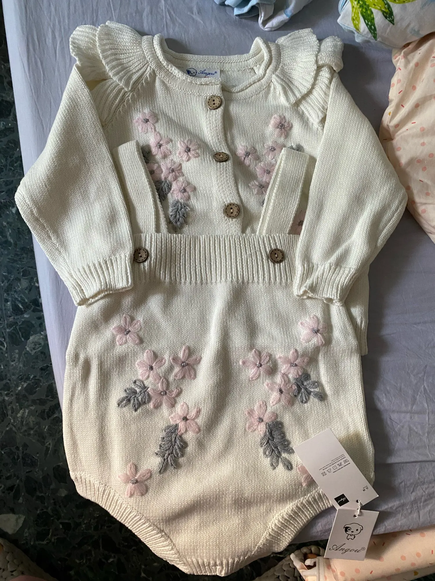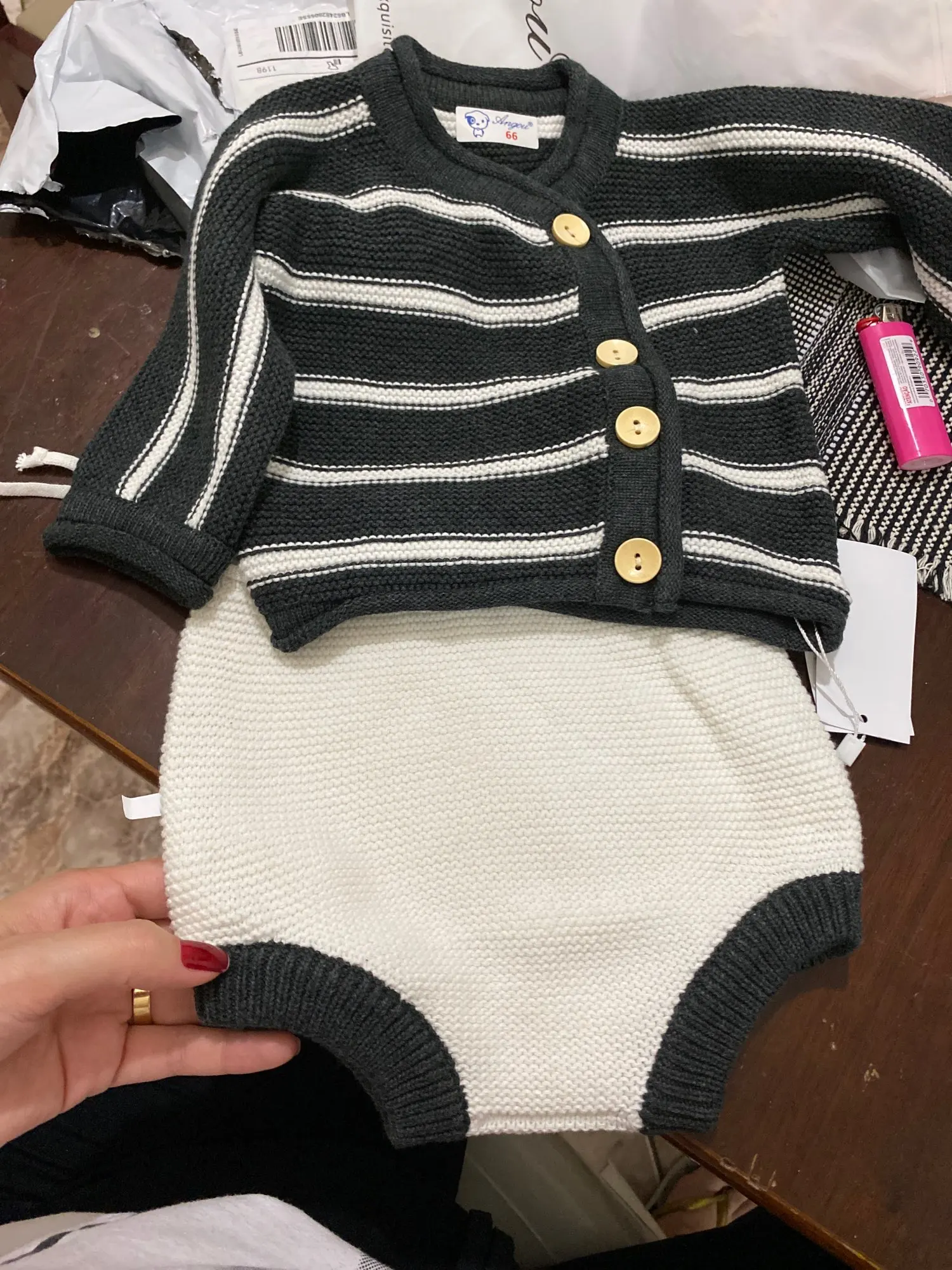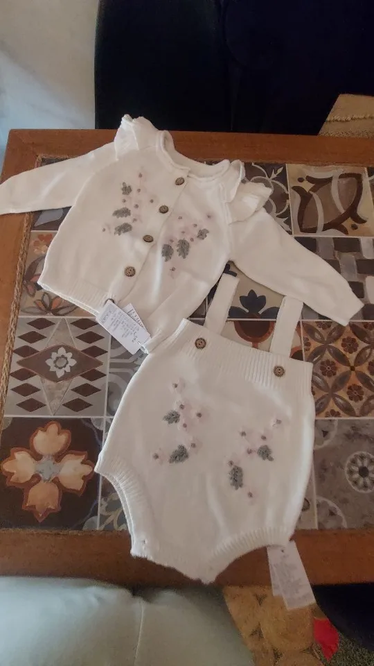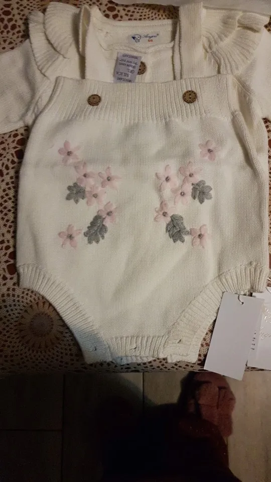 Прибыл в течение 10 дней в Лондон! Потрясающий. Это очень клево... подходит для холодной погоды. Моему ребенку 5,5 месяца... но 9,3 кг и 67 см. Комбинезон подходит для нее сейчас... просто для того, чтобы одеть кнопку на комбинезоне... но кардиган слишком большой. Теперь она может носить комбинезон и, возможно, снова осенью (я буду перемещать пуговицы снова), а также кардиган.