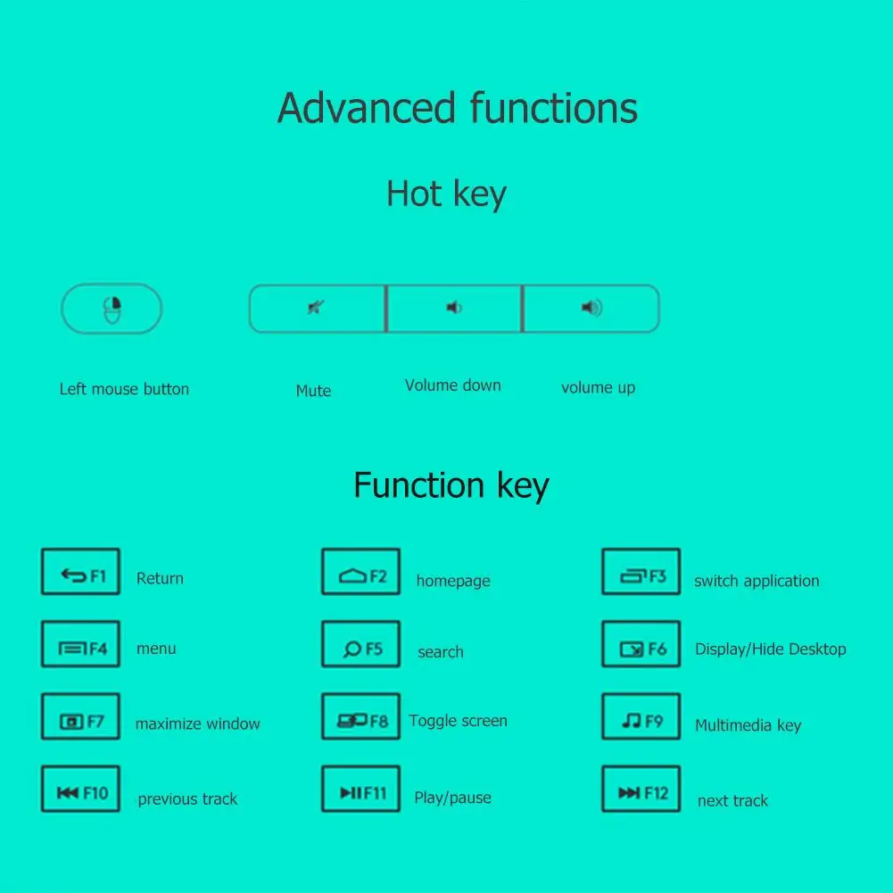 -Нет необходимости в любом процессе обучения ТВ-клавиатуре, легко начать работу, легкий доступ к регулятору громкости; Раскладка кнопок со стрелками упрощает навигацию; Вторая Левая кнопка, поддержка двусторонней навигации и выбора, сочетания клавиш для пользователей Android и Windows, горячие клавиши могут быть использованы непосредственно без какой-либо конфигурации;