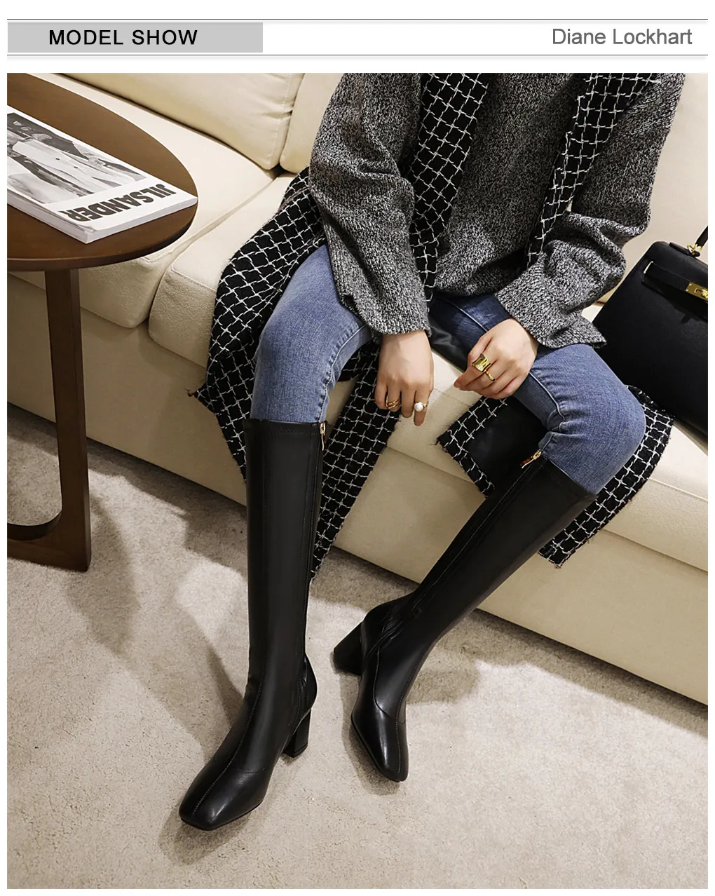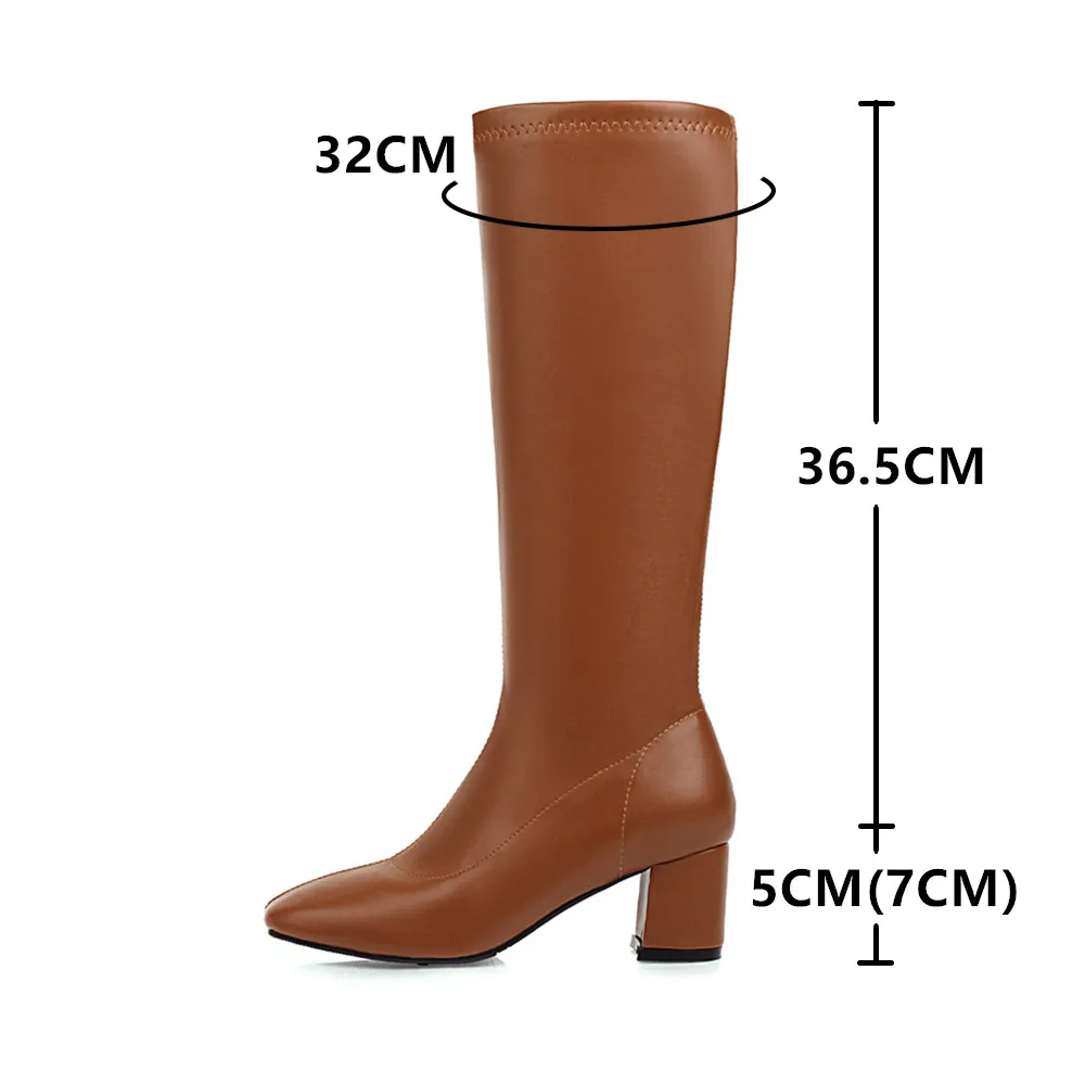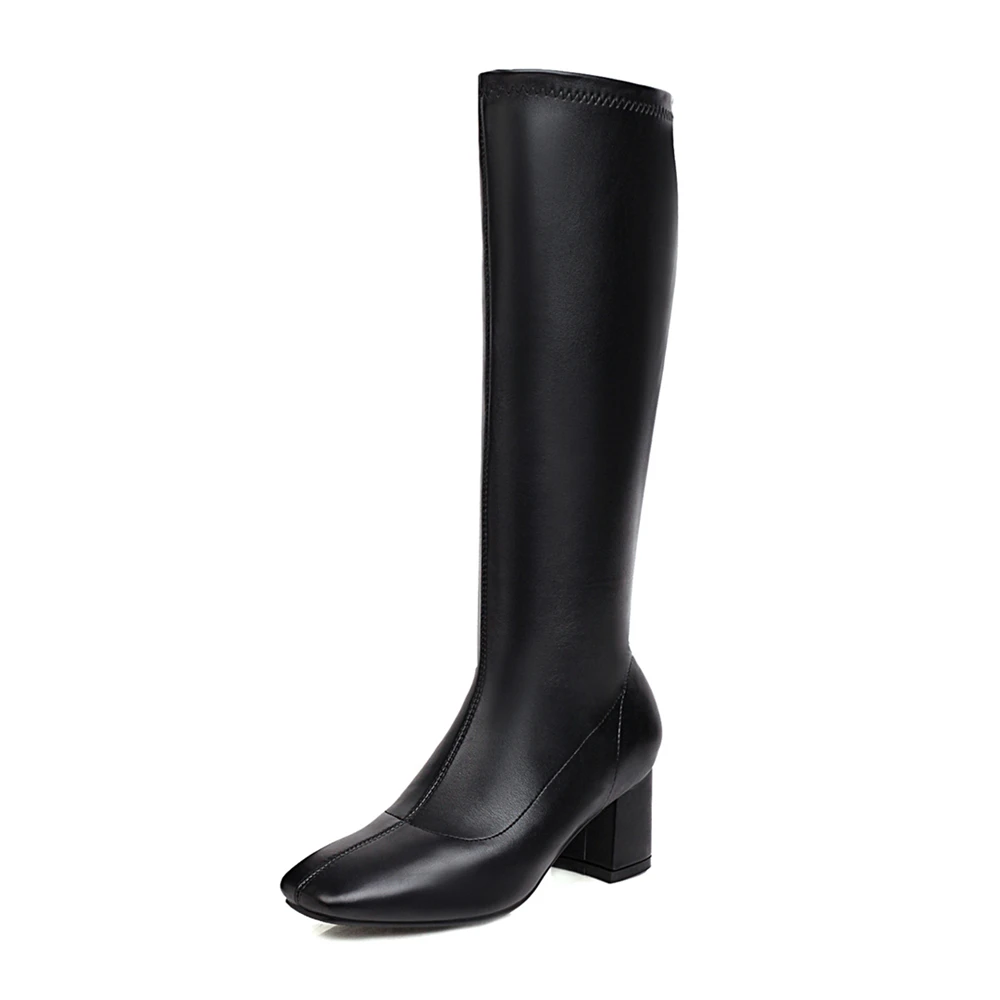Женские сапоги до колена, классические сапоги из искусственной кожи на квадратном каблуке, вечерние молнии, вечернее платье, танцевальная обувь, женская обувь 31-43