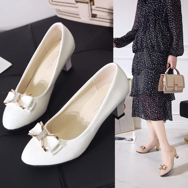 Женские модельные туфли; Туфли-лодочки из лакированной кожи; Офисная Женская обувь на среднем каблуке; Свадебные туфли с бантом; zapatos mujer; Большие размеры 35-42; 8394C