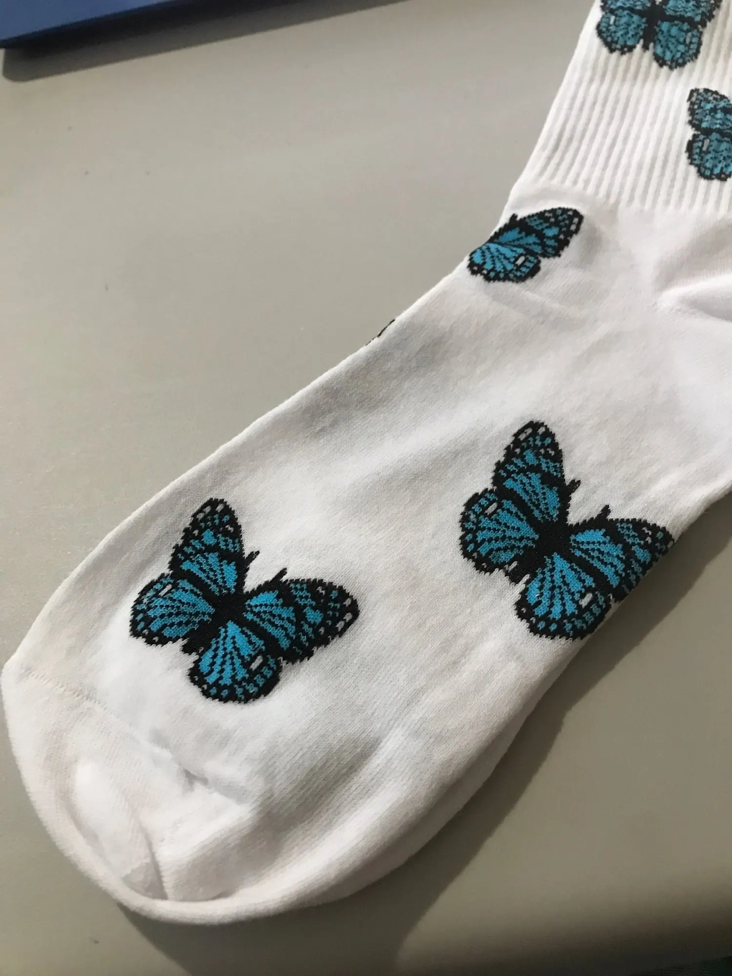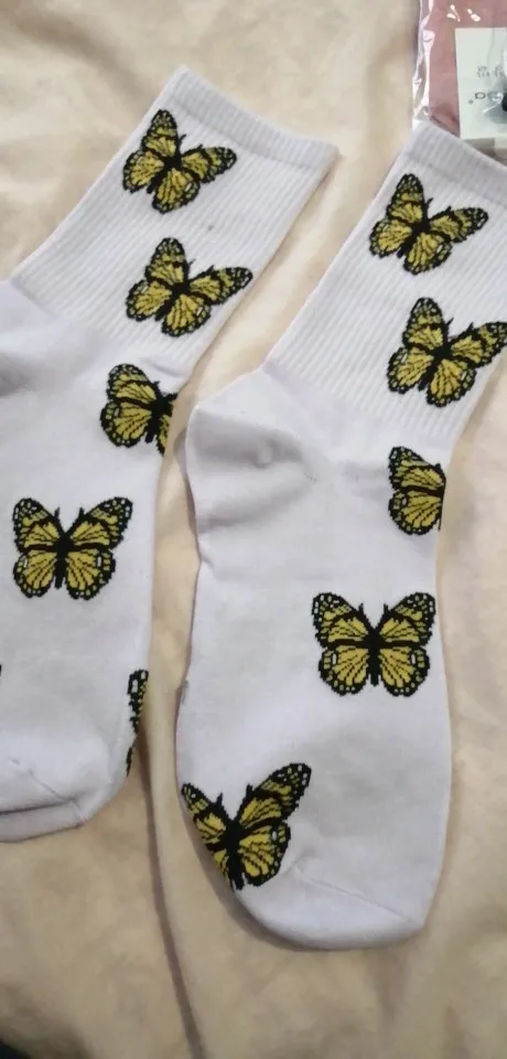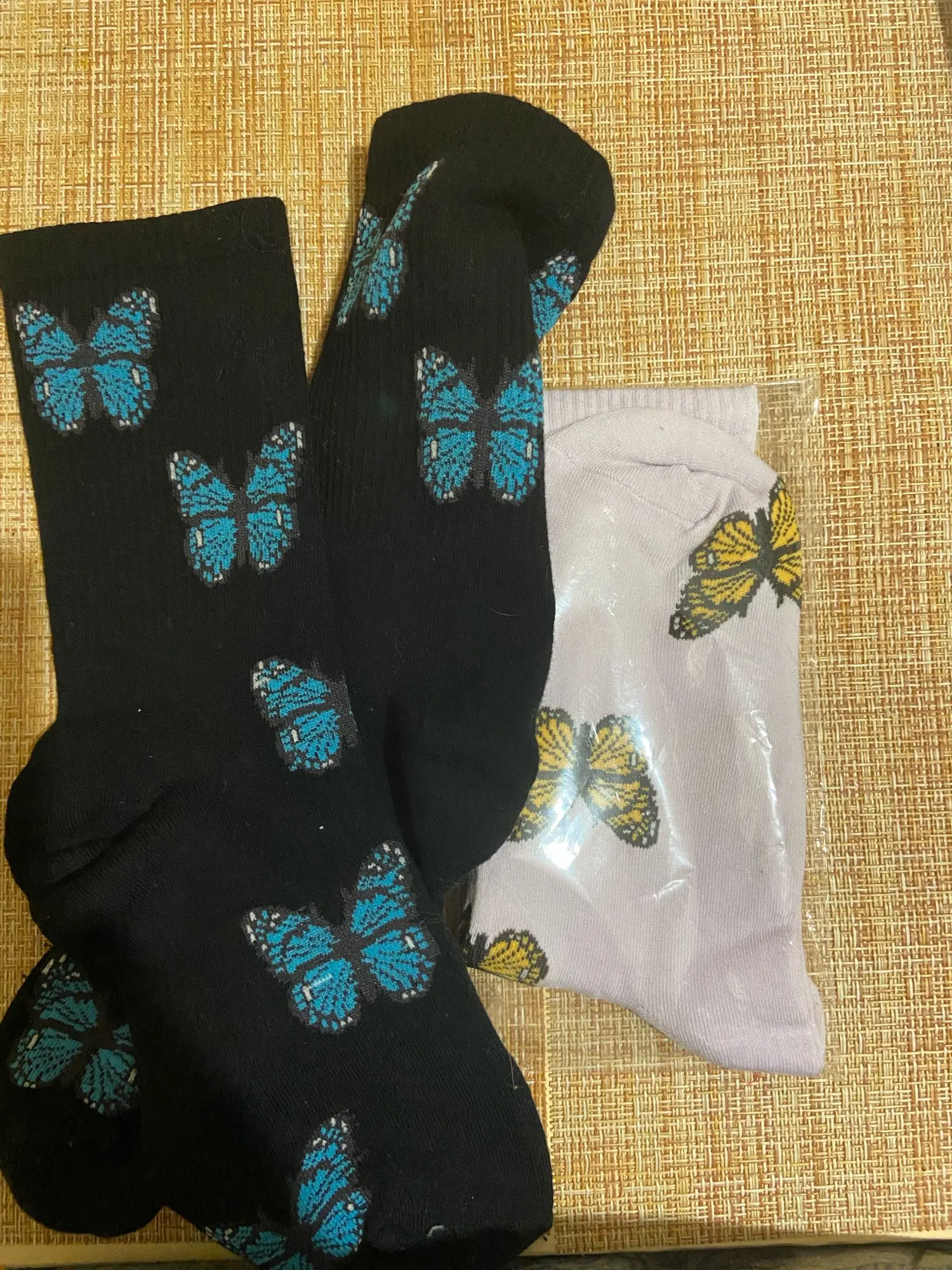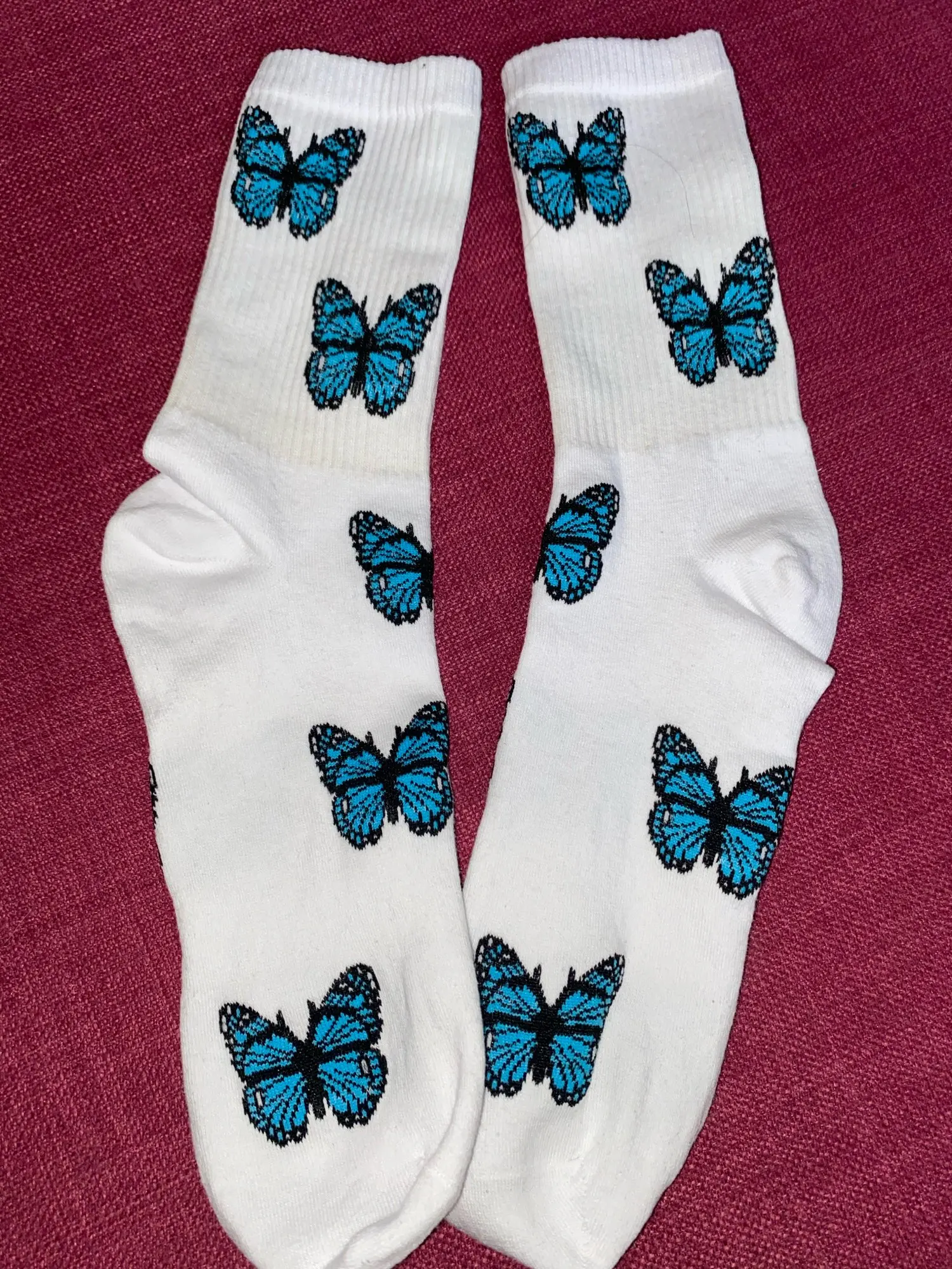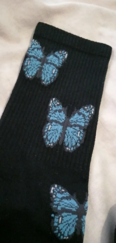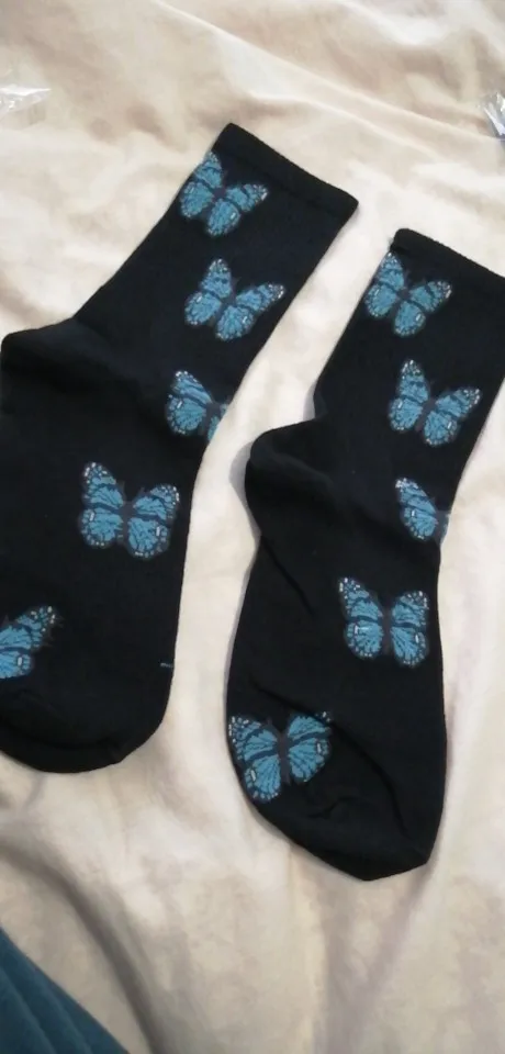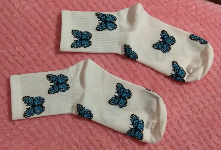 Цвет лавандовых носков с бабочками намного бледнее, чем на фотографии.