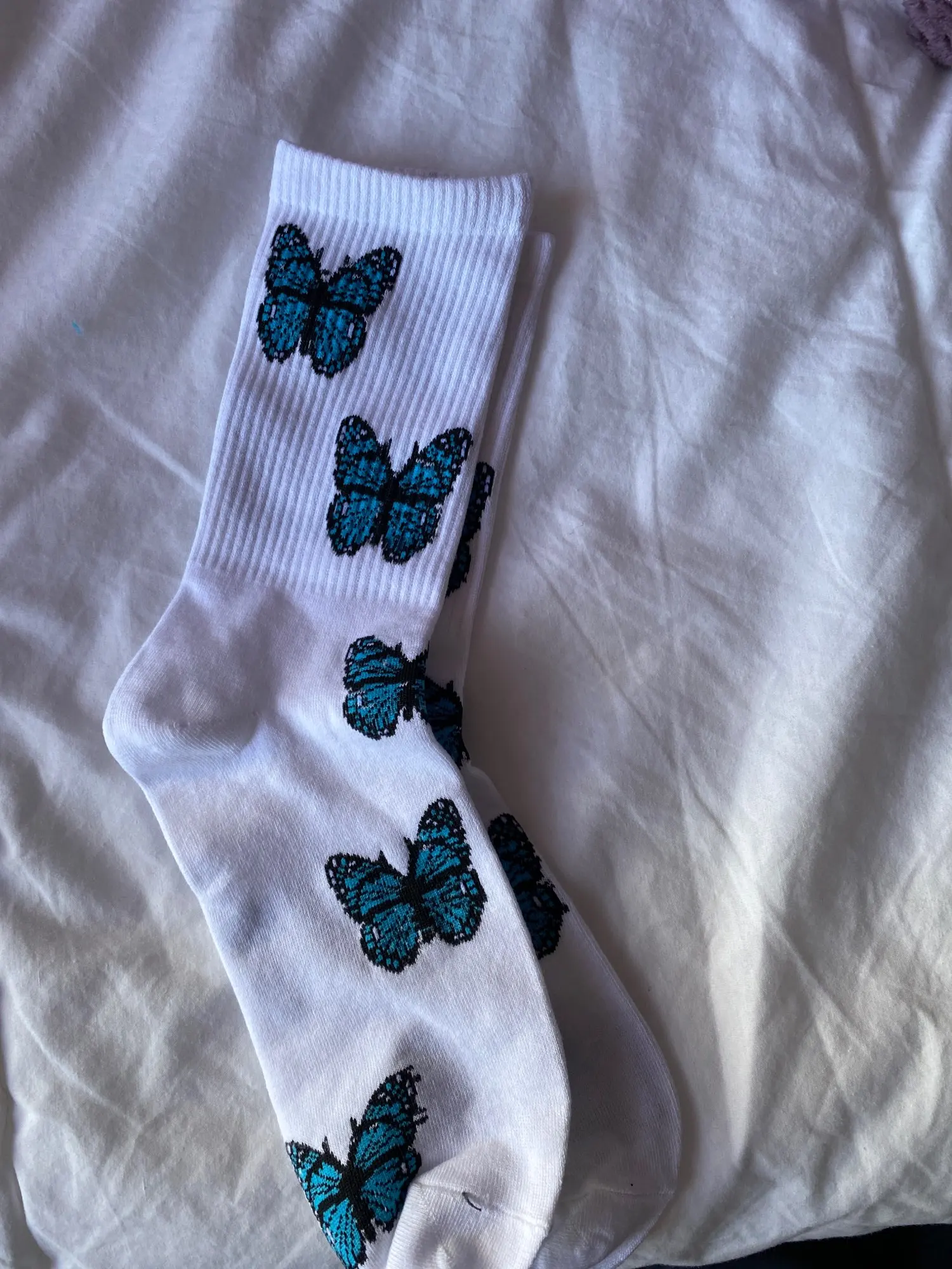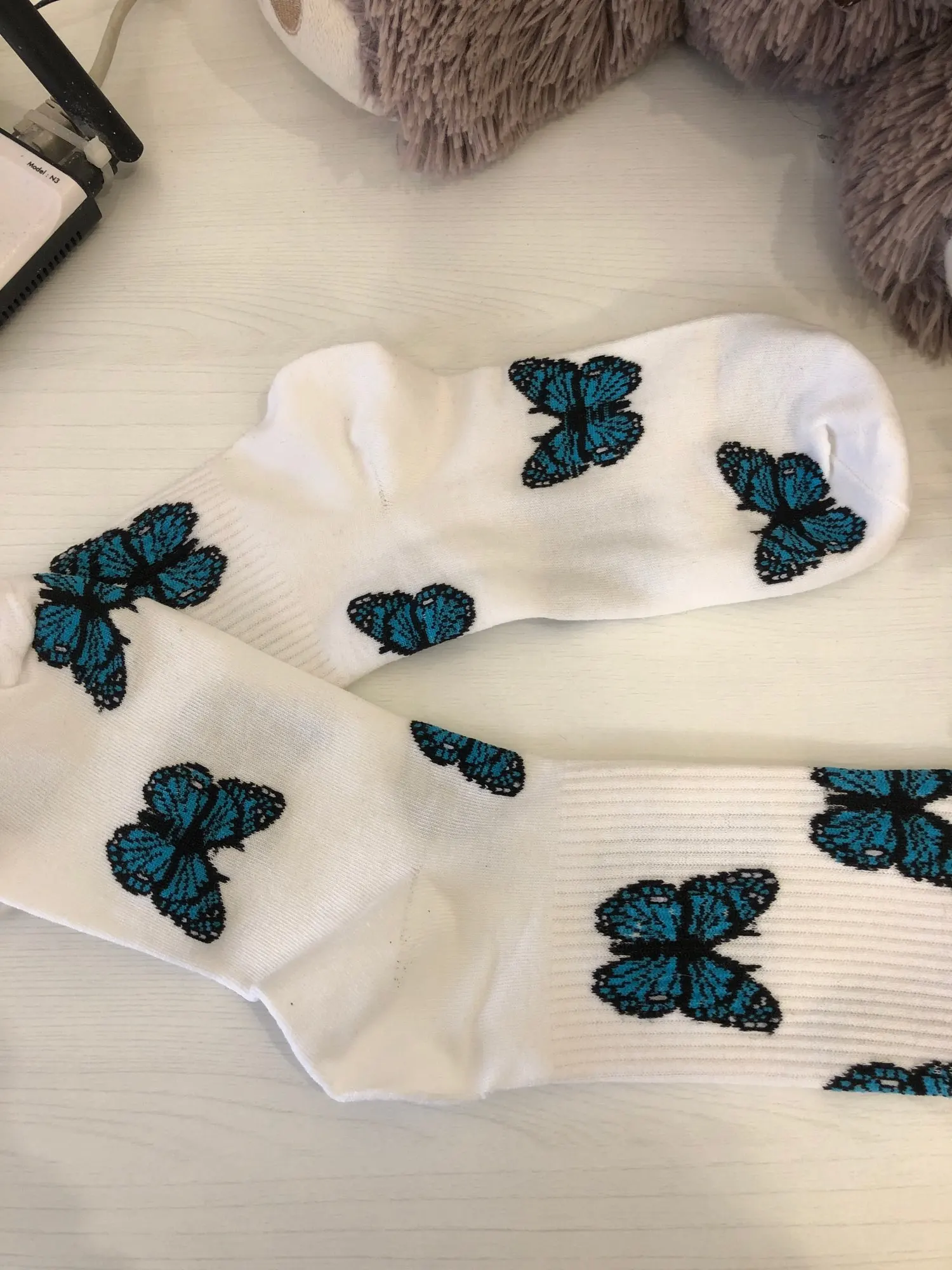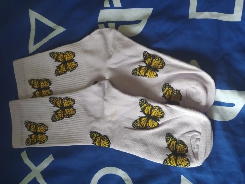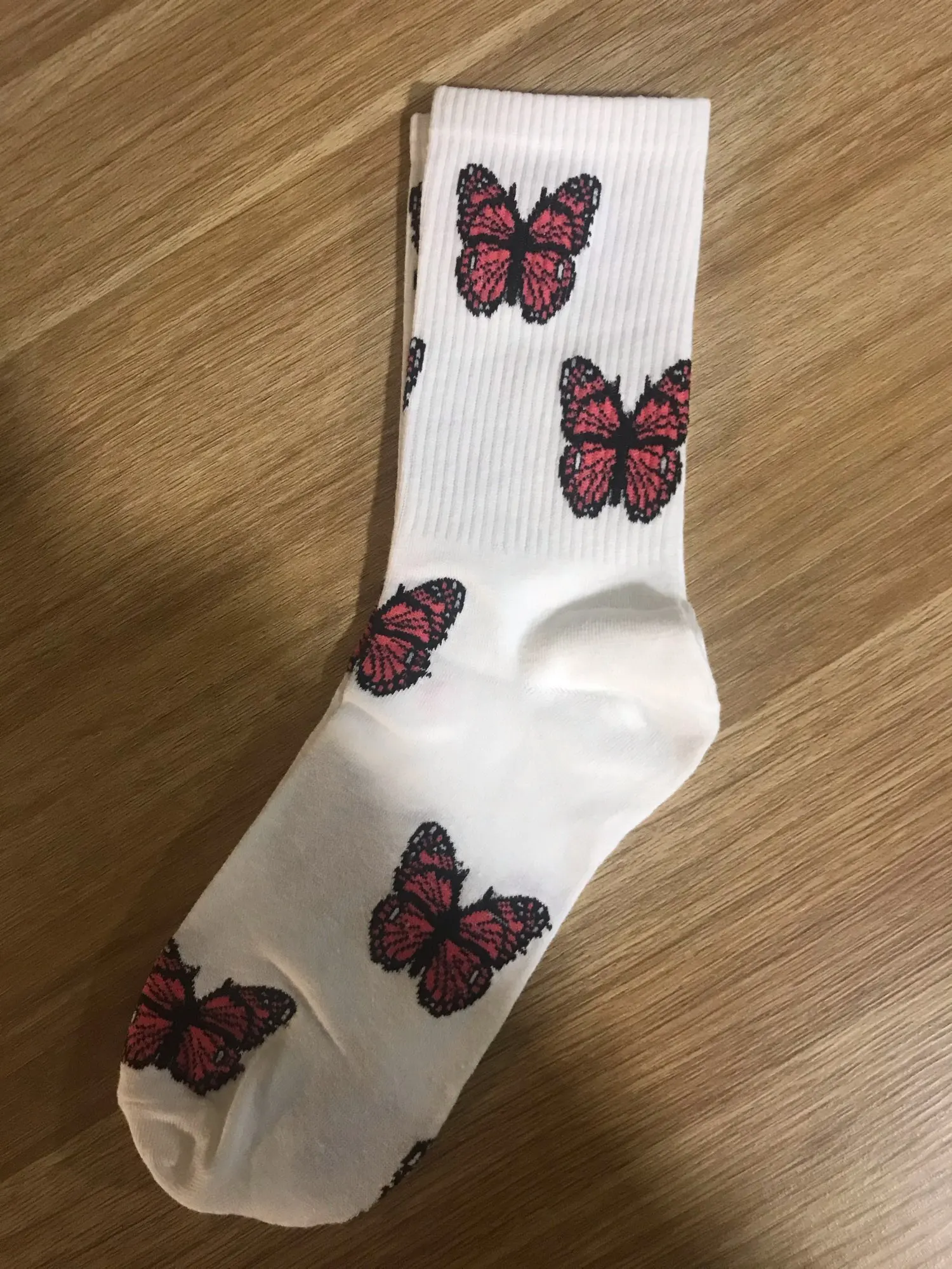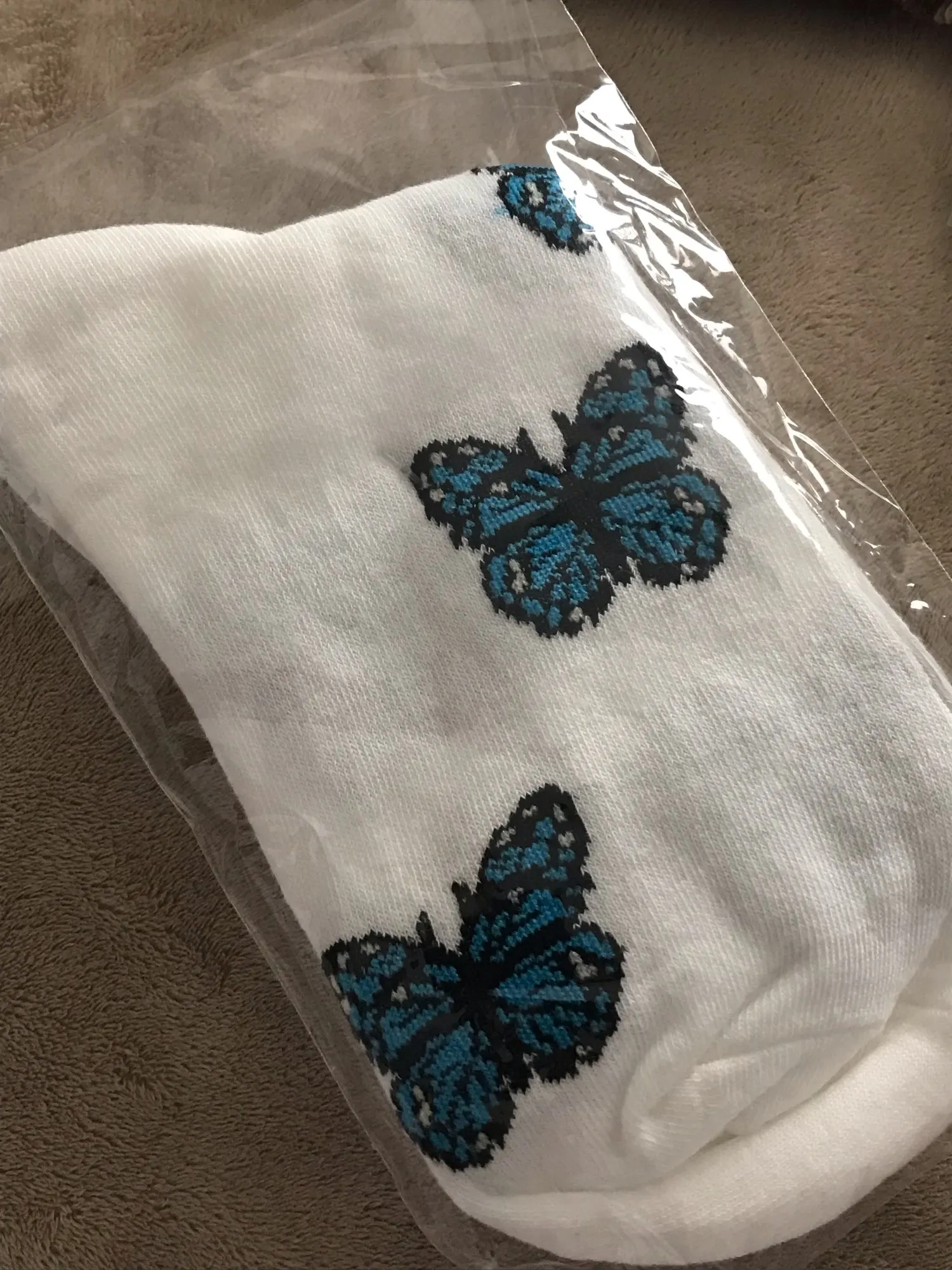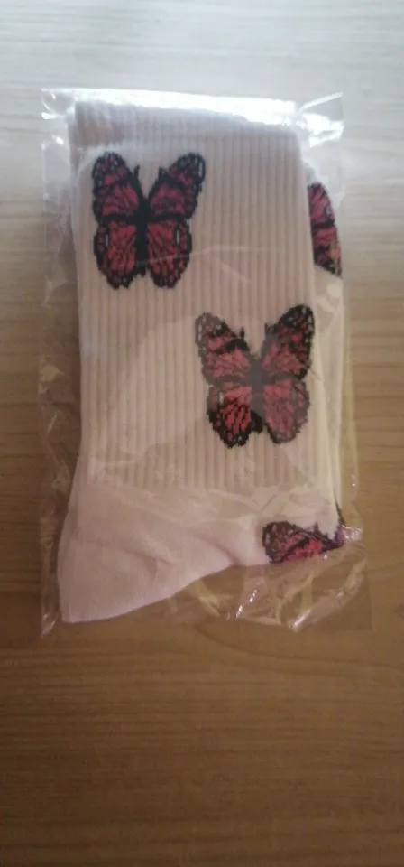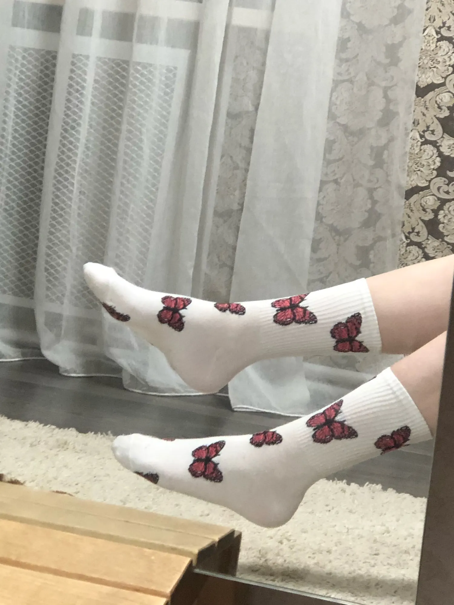 Цвет лавандовых носков с бабочками намного бледнее, чем на фотографии.