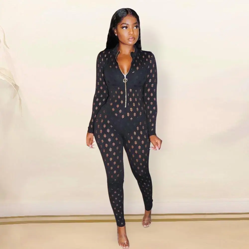 Женские однотонные кружевные комбинезоны, сексуальные женские комбинезоны на молнии с V-образным вырезом и длинным рукавом, ажурные Комбинезоны-карандаш, Новинка осени 2020