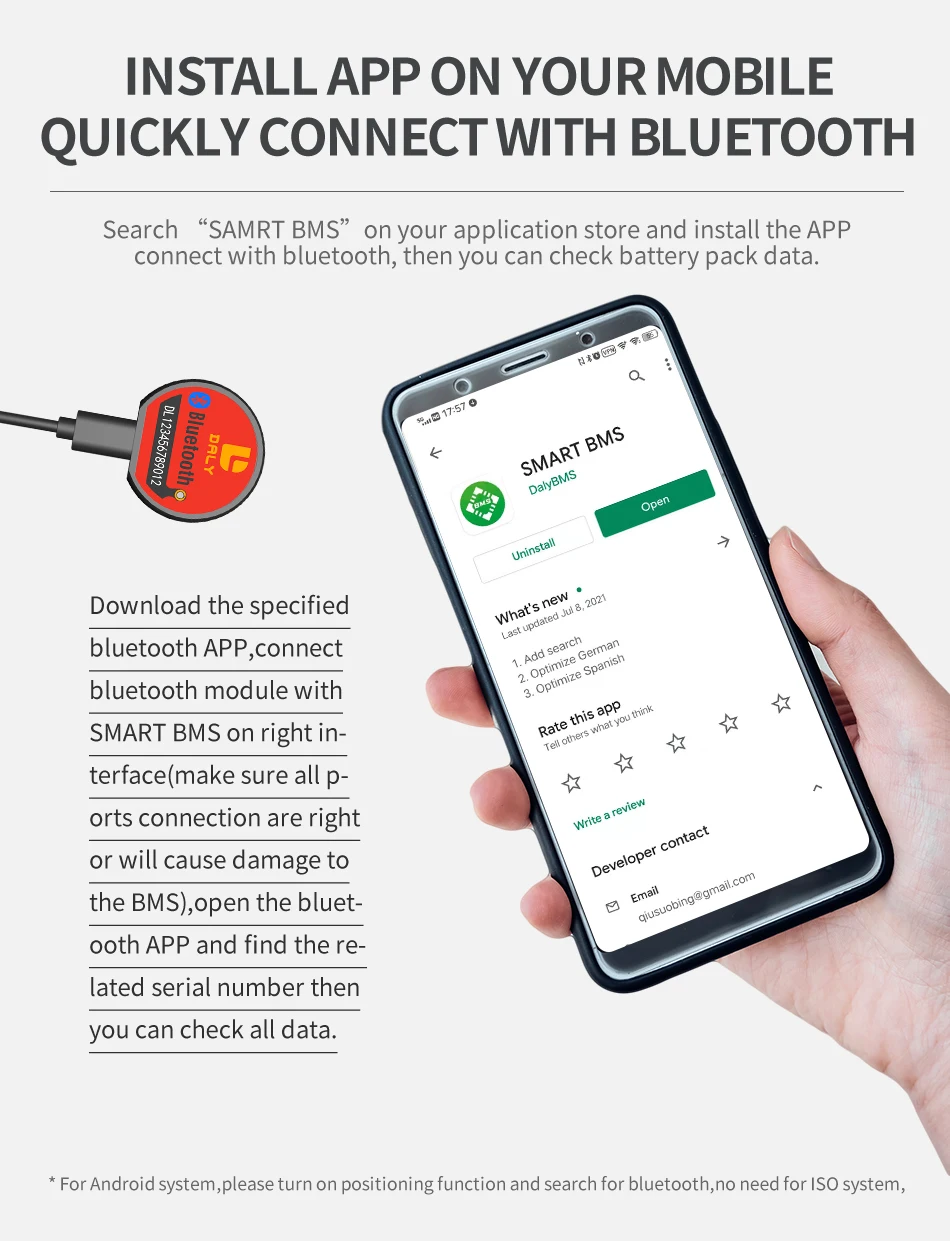 ◆ Посылка комплект поставки BMS входят аксессуары, модуль BT * 1 кабель NTC (датчик температуры). И балансный кабель * 1 шт. и руководство на английском языке * 1 шт. посылка также входит кабель B-P,