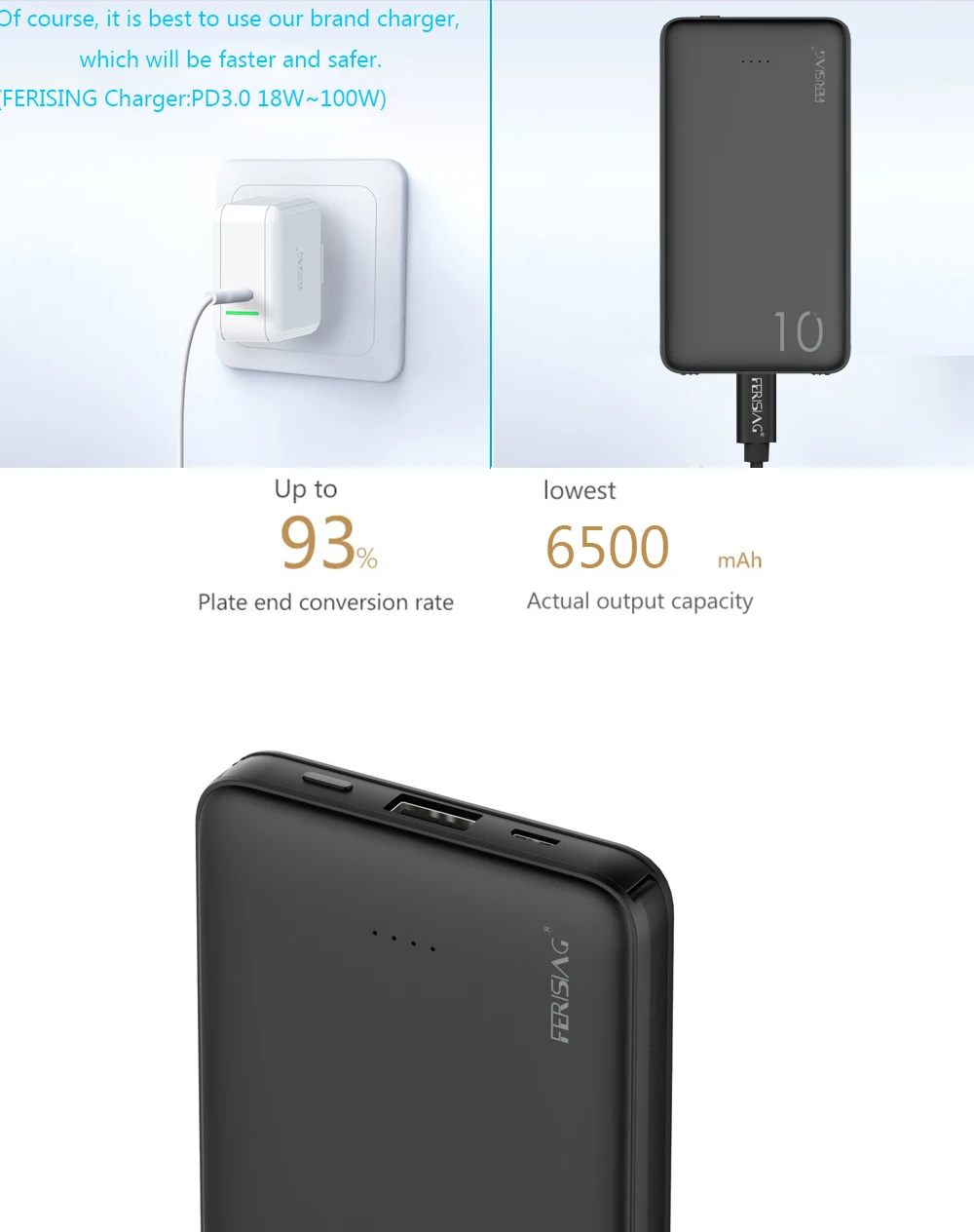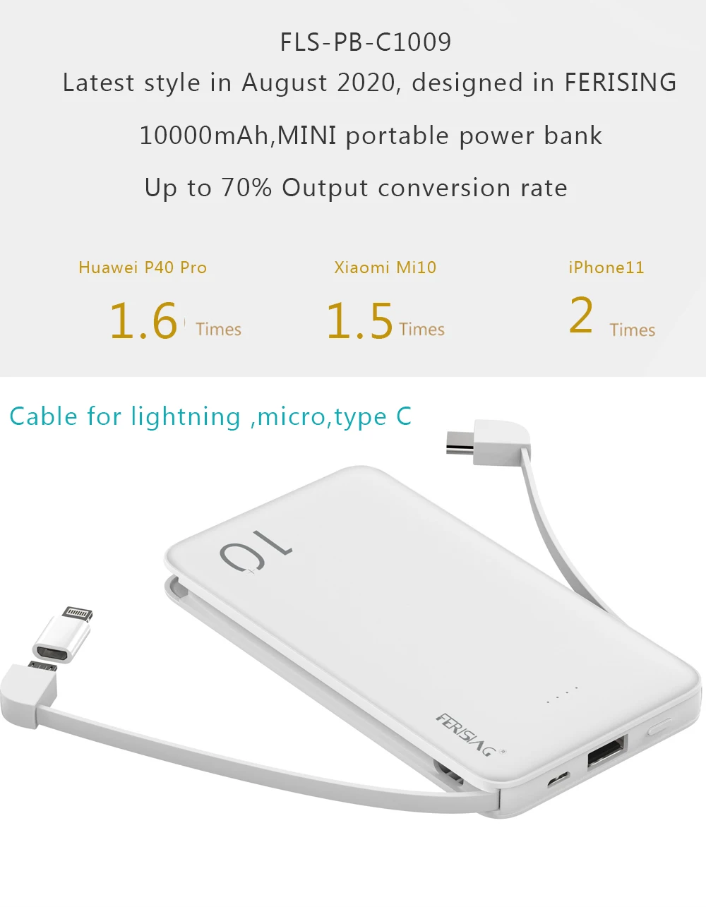 FERISING 3в1 10000 мАч Внешний аккумулятор тонкий USB внешний аккумулятор портативный внешний аккумулятор зарядное устройство для iPhone Xiaomi Mi 9 повербанк