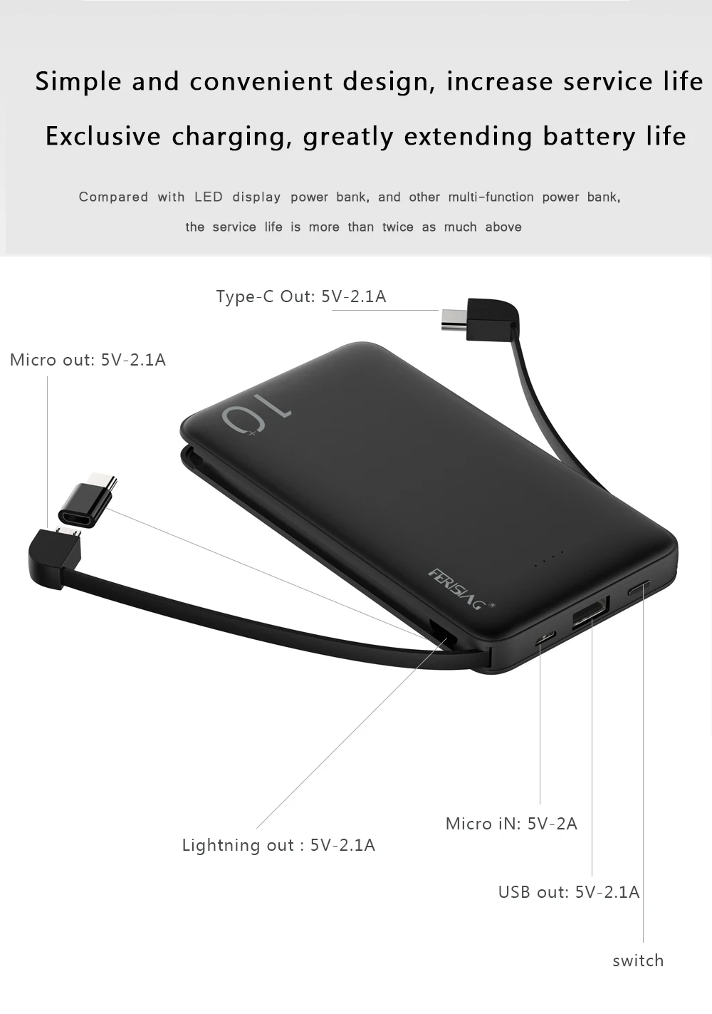 Внешний аккумулятор ferzing на 10000 мА ч с USB и кабелем 3 в 1