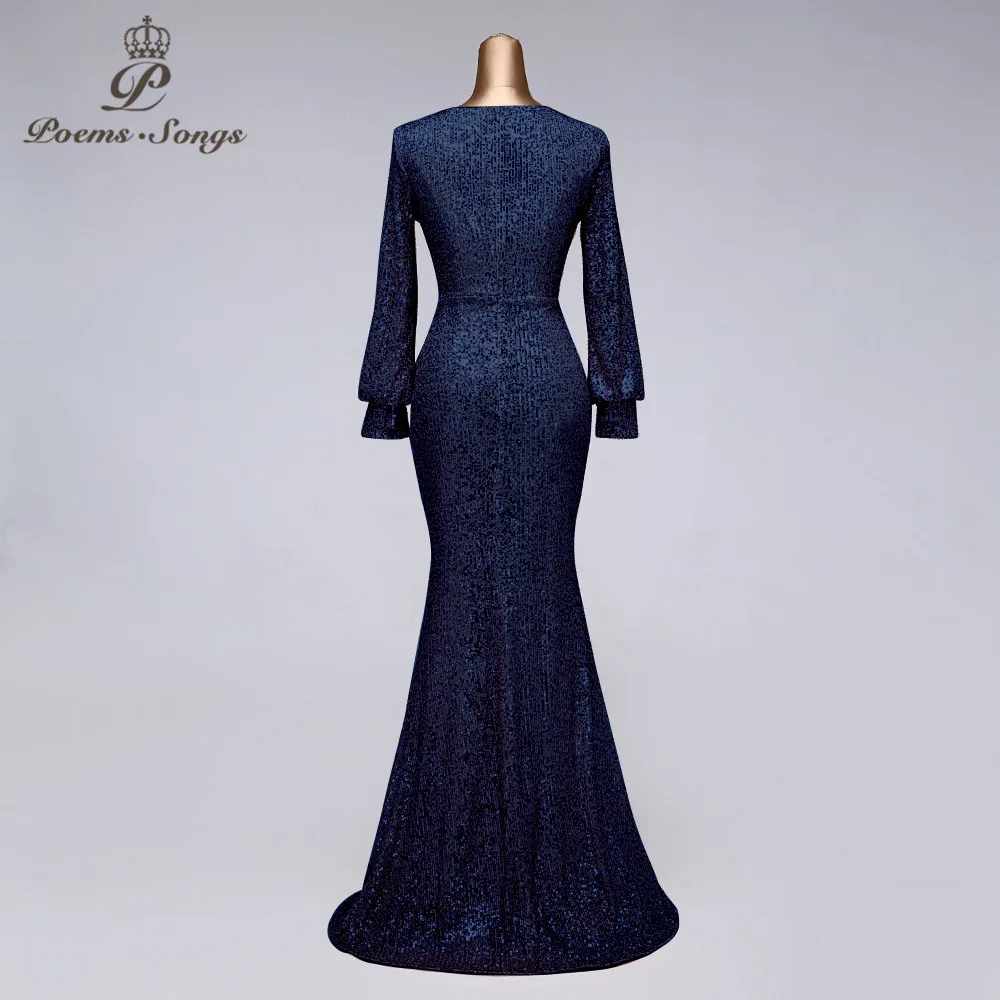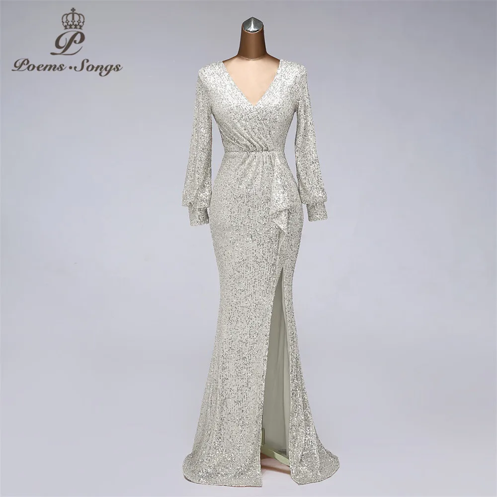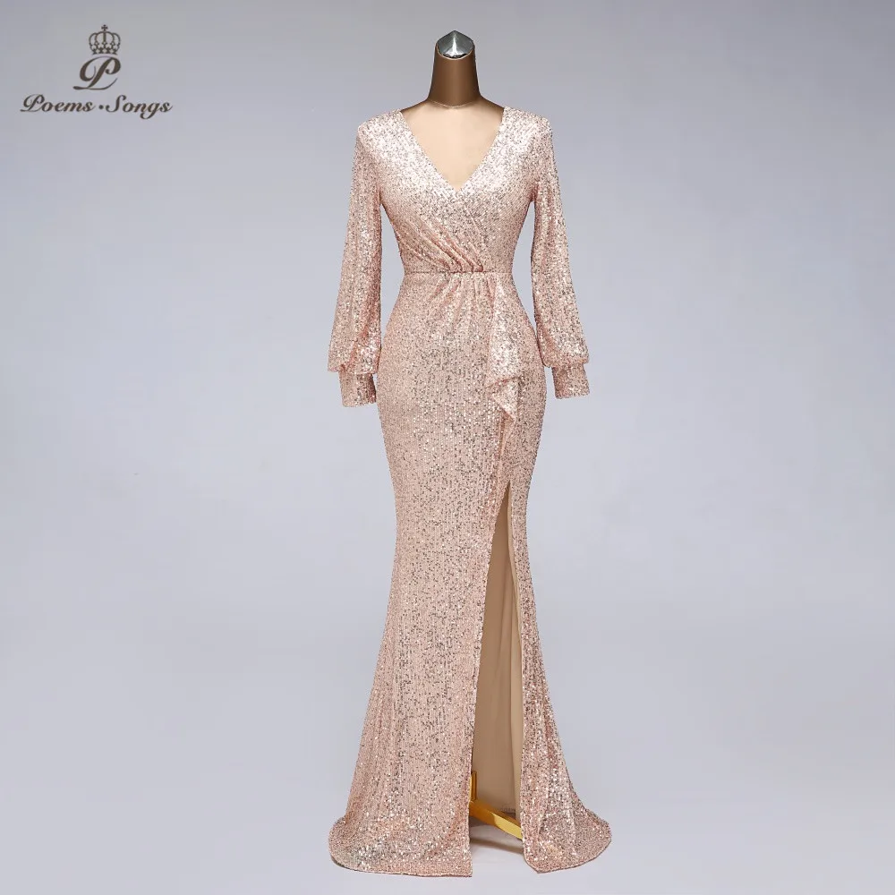 Вечернее платье с длинным рукавом, блестками, разрезом сбоку