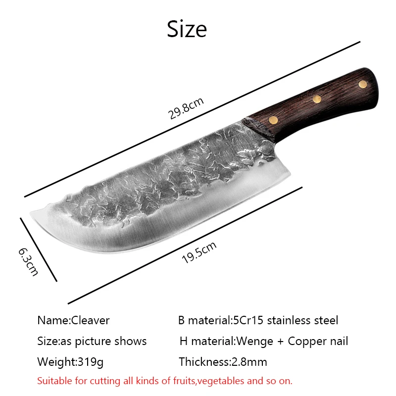 Этот нож не подходит для рубки костей.Стирать вручную и сушить мягкой тканью сразу после использованияТип ножа: нож-КливерОсобенность: экологически чистыйМатериал кливера: Высокоуглеродистая сталь 5Cr15Размер: как показано на рисункеТовар включает:Размер 1 : 1 мини-КливерИлиРазмер 2 : 1 точилка + точилкаИлиРазмер 3 : 1 Тесак + мини-тесакПожалуйста, обратите внимание:1. Весь процесс производства этого ножа полностью ручной.2. Поверхность кузнечного ножа шероховатая, не такая гладкая, как нож, производимый машинами, но она действительно показывает характеристики Ковочного ножа.3. Сохранение традиционного мастерства не позволяет использовать современное оборудование.4. Возможны незначительные отклонения в измерениях из-за ручного измерения.