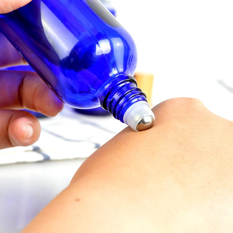 Особенности продукта:12 штук кобальтовое стекло роликовые бутылки с гладкими роликами из нержавеющей стали и черными колпачками.