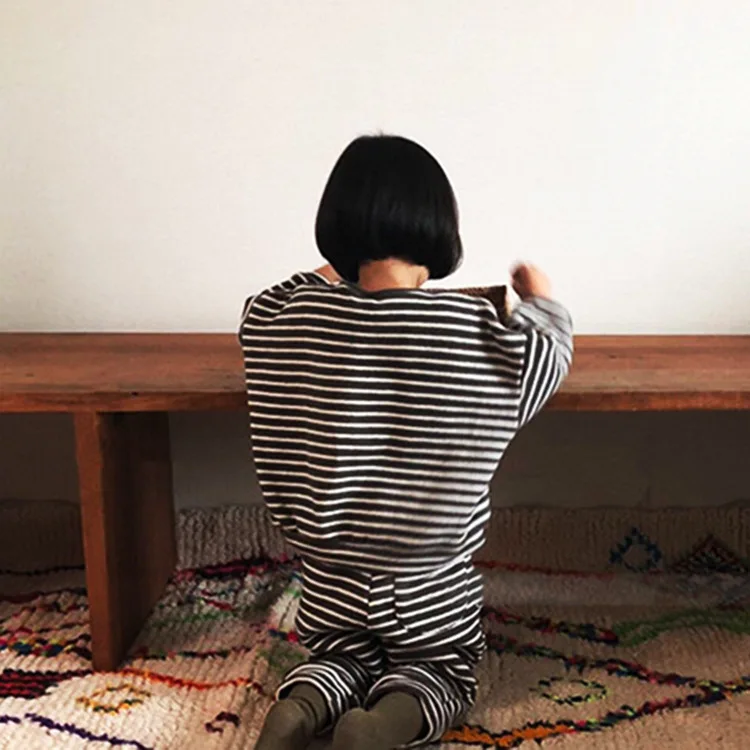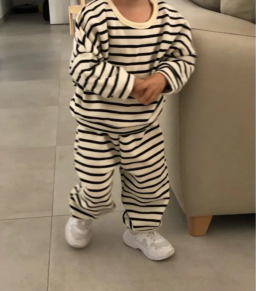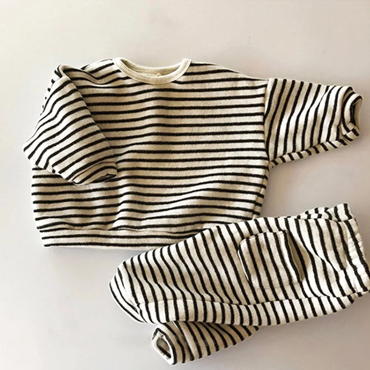 Осень-зима 2021, детская одежда в Корейском стиле, универсальный махровый костюм в полоску для мальчиков и девочек