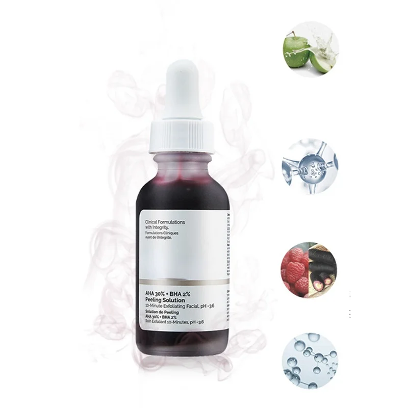 С 30% альфа-гидрокси-кислотами (гликолевая/молочная/тартарная/Лимонная), 2% бета-гидрокси-кислота (салициловая кислота), кроссполимер гиалуроновой кислоты, витамин B5, черная морковка и тасманическая перберри