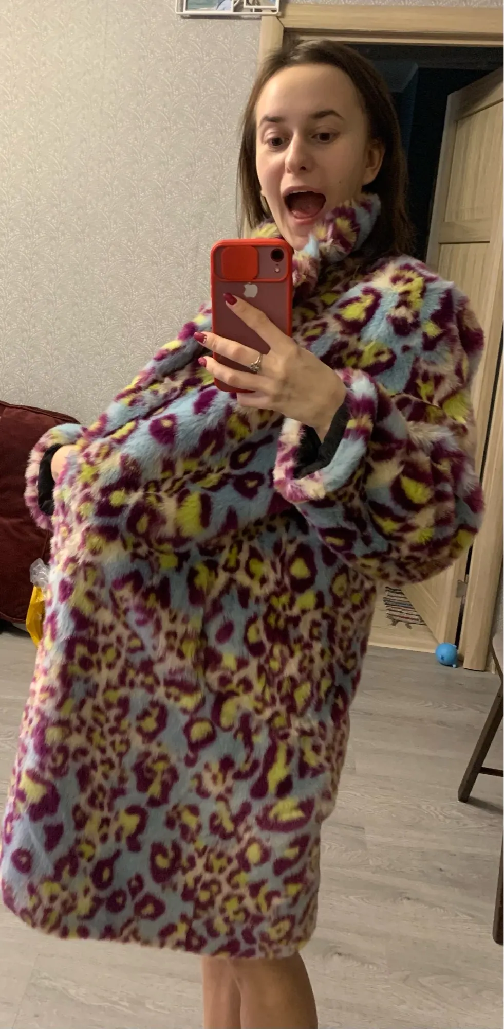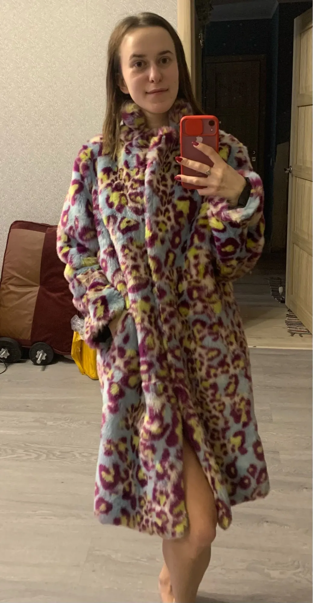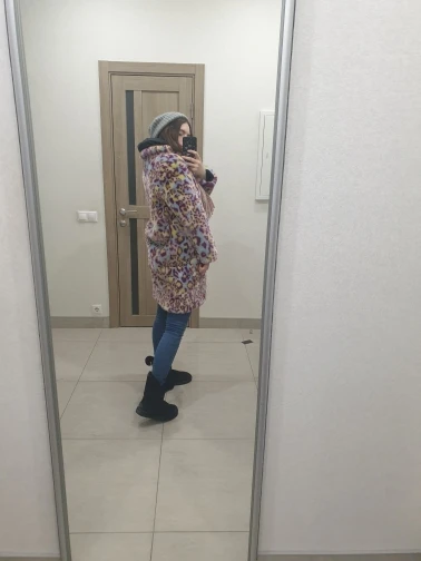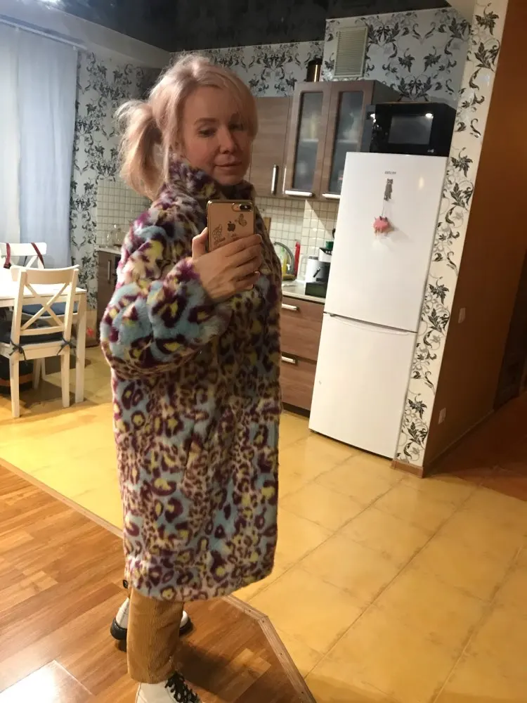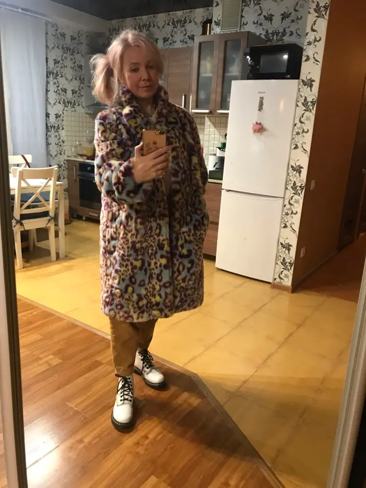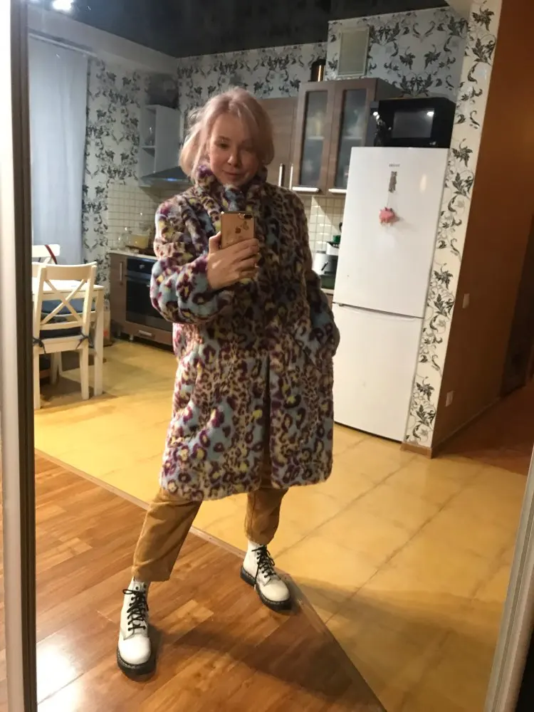 Сама шуба прикольная, мех хороший- не лезет, достаточно увесистая и тёплая. Ну и самый цимес, из-за чего мы все тут собрались, в её цвете, а он шикарный. Кислотный леопард для каждой уважающей себя городской сумасшедшей.) Но вот с размером сильно прогадала, все побежали и я побежал)) Все заказали 7хл и я тоже. На деле шуба очень большая, слишком Oversize. Уж не знаю как хрупкие барышни могут носить настолько оверсайз. Она к тому же тяжелее. Плечи делает огромными. Поэтому советую заказывать по своему размеру. Не знаю буду ли возвращать, но носить так невозможно. Только ушивать.