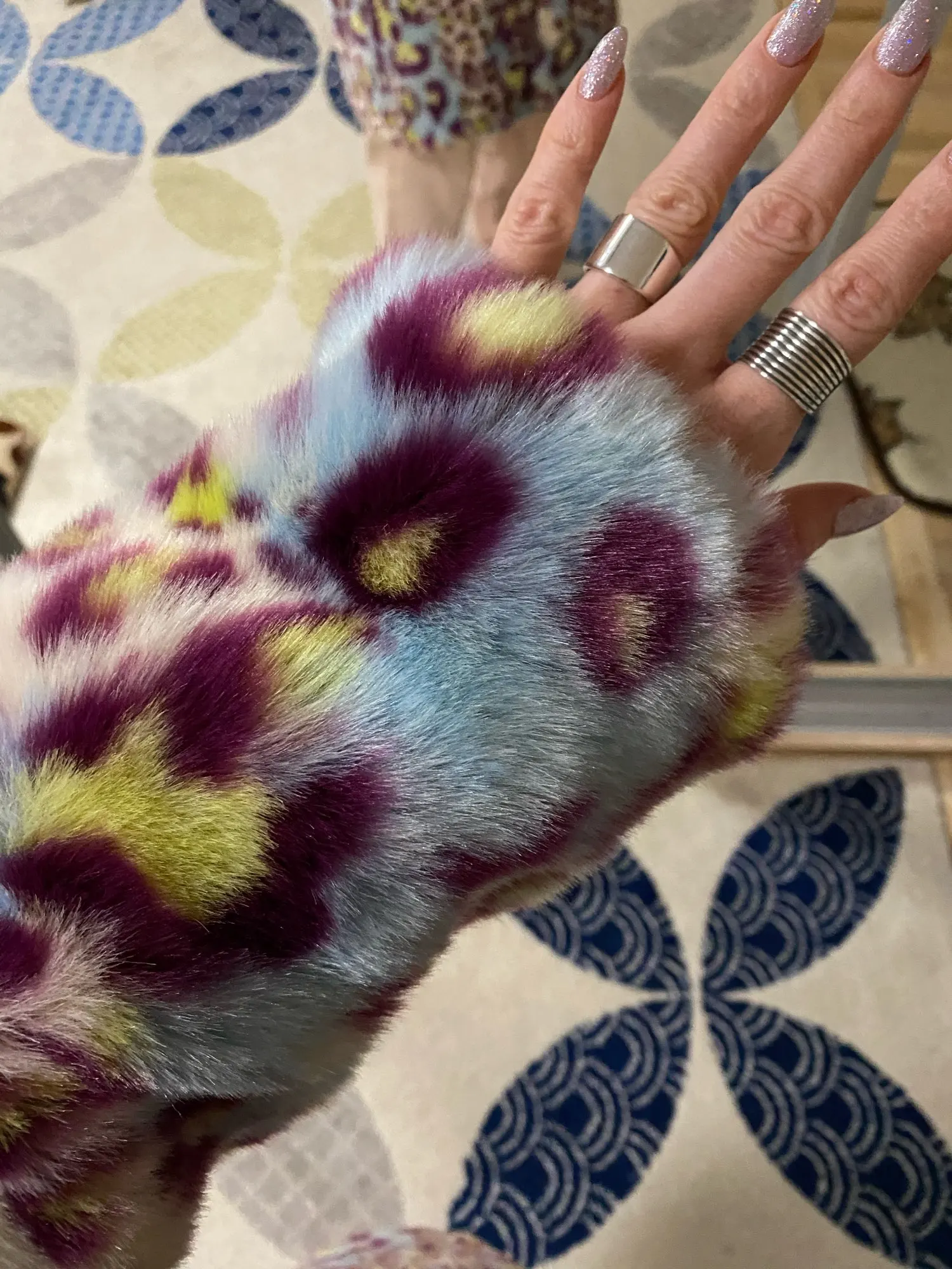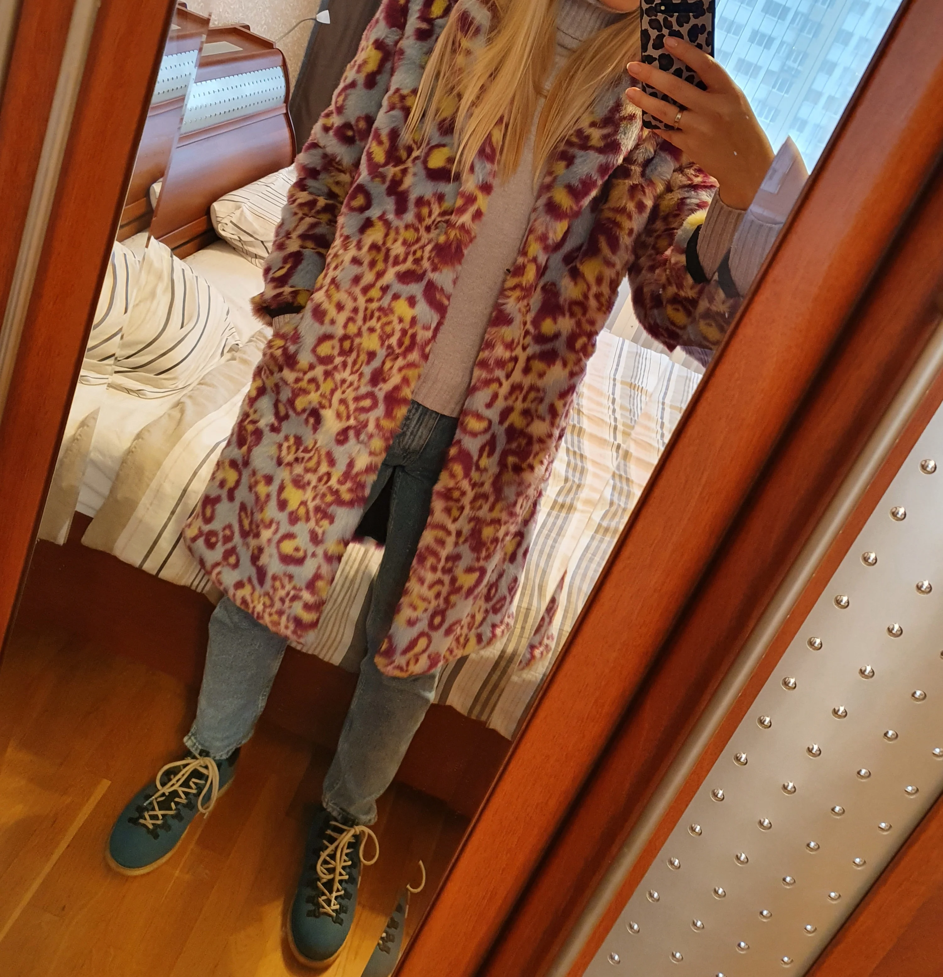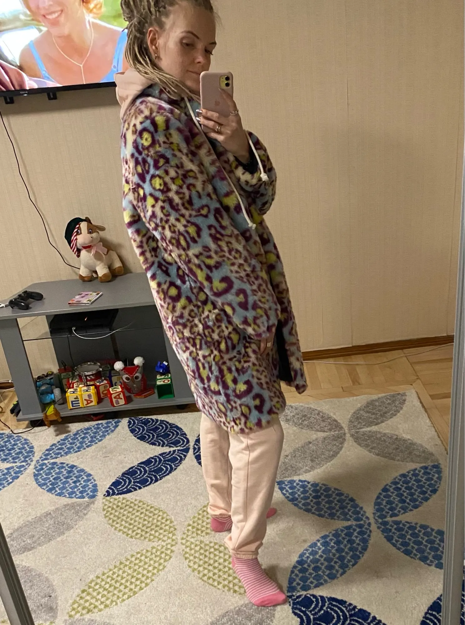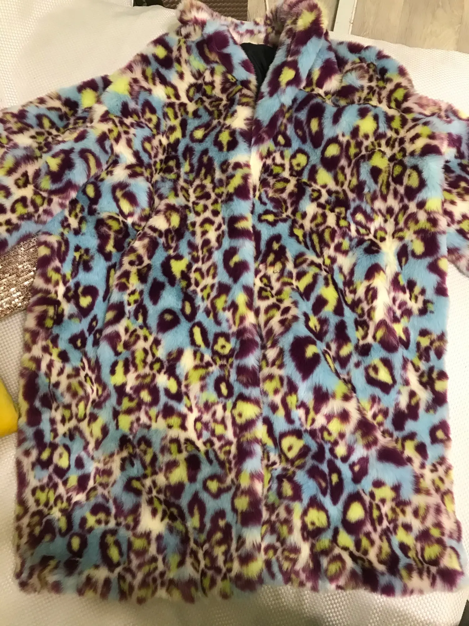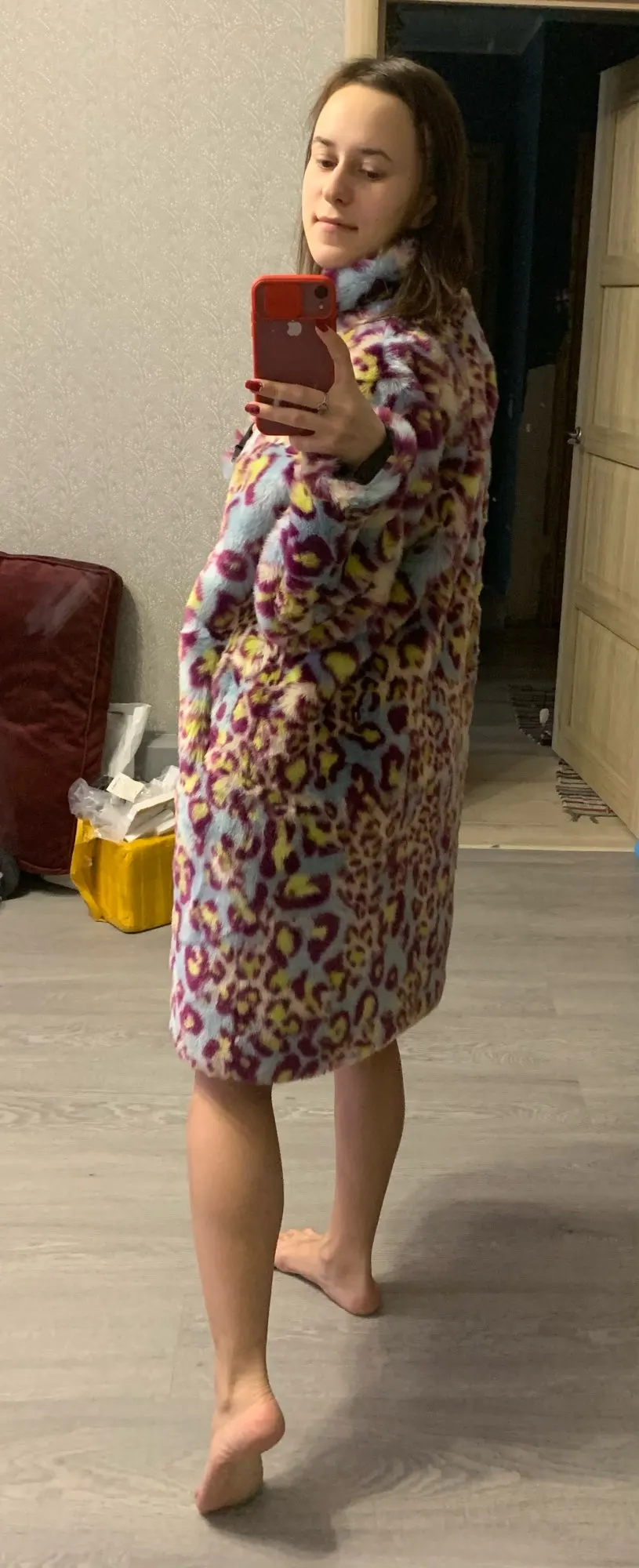 Сама шуба прикольная, мех хороший- не лезет, достаточно увесистая и тёплая. Ну и самый цимес, из-за чего мы все тут собрались, в её цвете, а он шикарный. Кислотный леопард для каждой уважающей себя городской сумасшедшей.) Но вот с размером сильно прогадала, все побежали и я побежал)) Все заказали 7хл и я тоже. На деле шуба очень большая, слишком Oversize. Уж не знаю как хрупкие барышни могут носить настолько оверсайз. Она к тому же тяжелее. Плечи делает огромными. Поэтому советую заказывать по своему размеру. Не знаю буду ли возвращать, но носить так невозможно. Только ушивать.