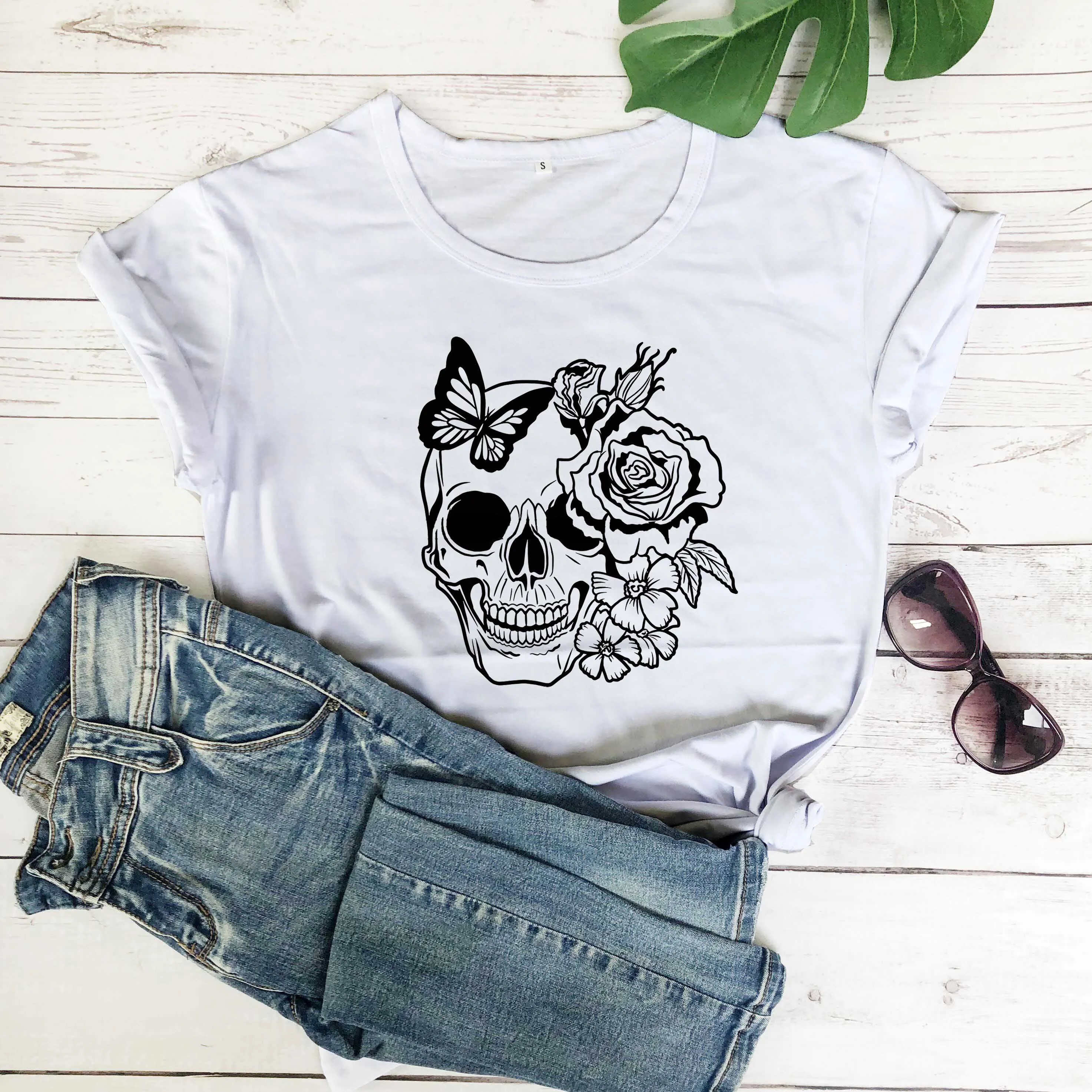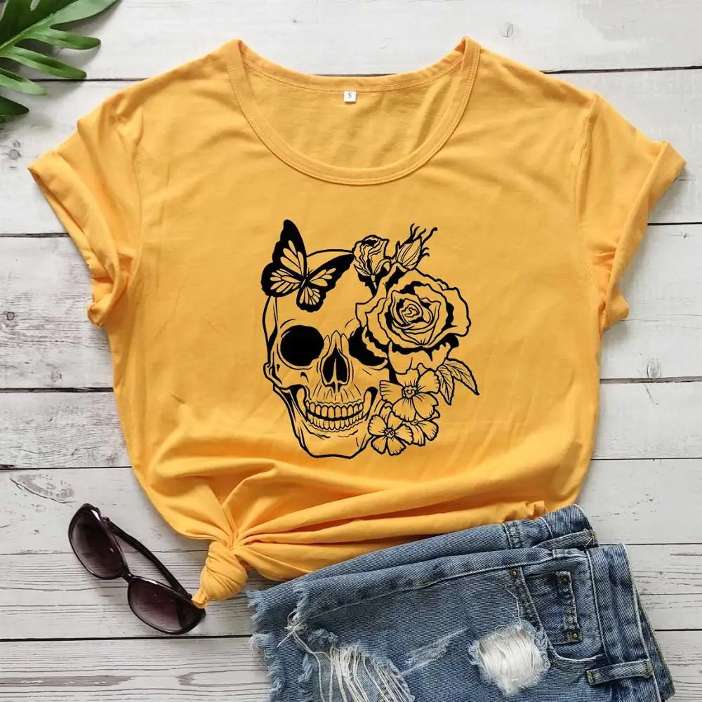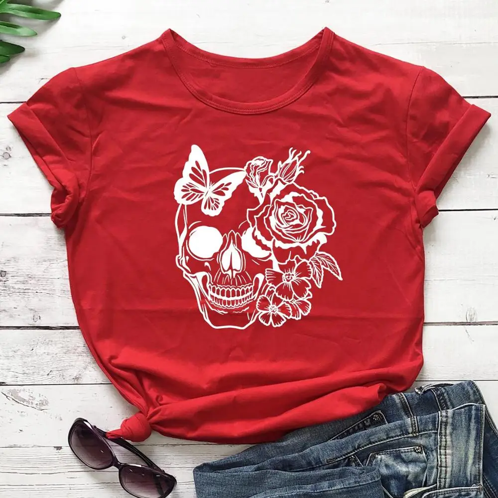 Футболка женская повседневная с принтом черепа, розы, цветов, бабочки, Грина, смерти, любовь, Мертвая голова, зло, убийца, дизайнерская футболка из 100% хлопка