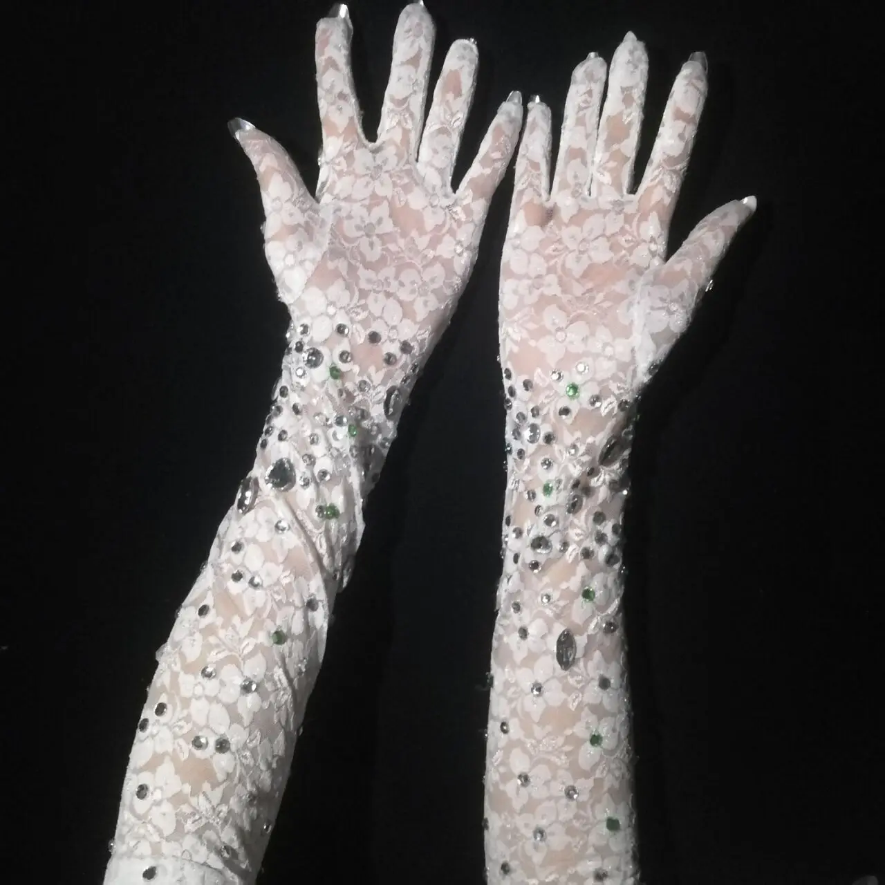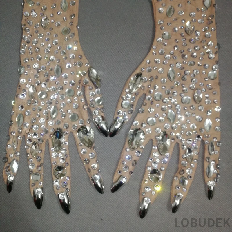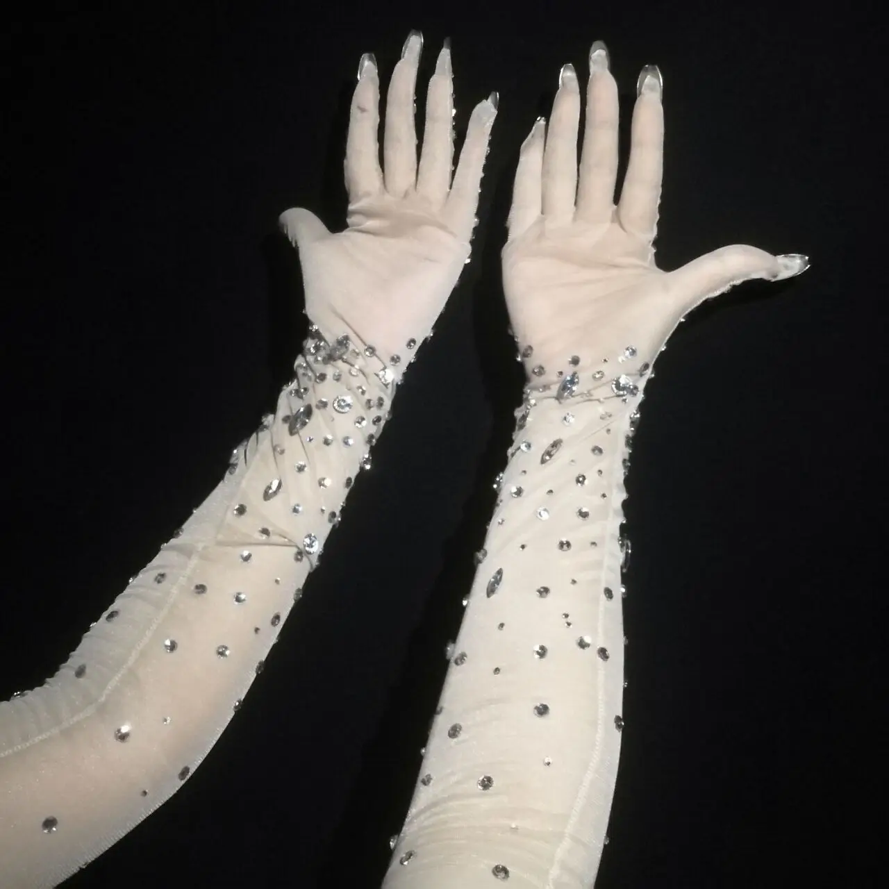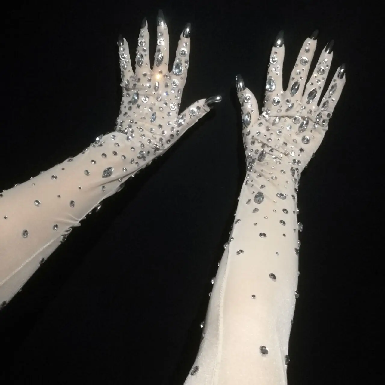 Эластичные прозрачные белые перчатки для Стразы серебристого цвета, украшение для певицы, кристаллы, аксессуары для вечеринок, длинные митенки