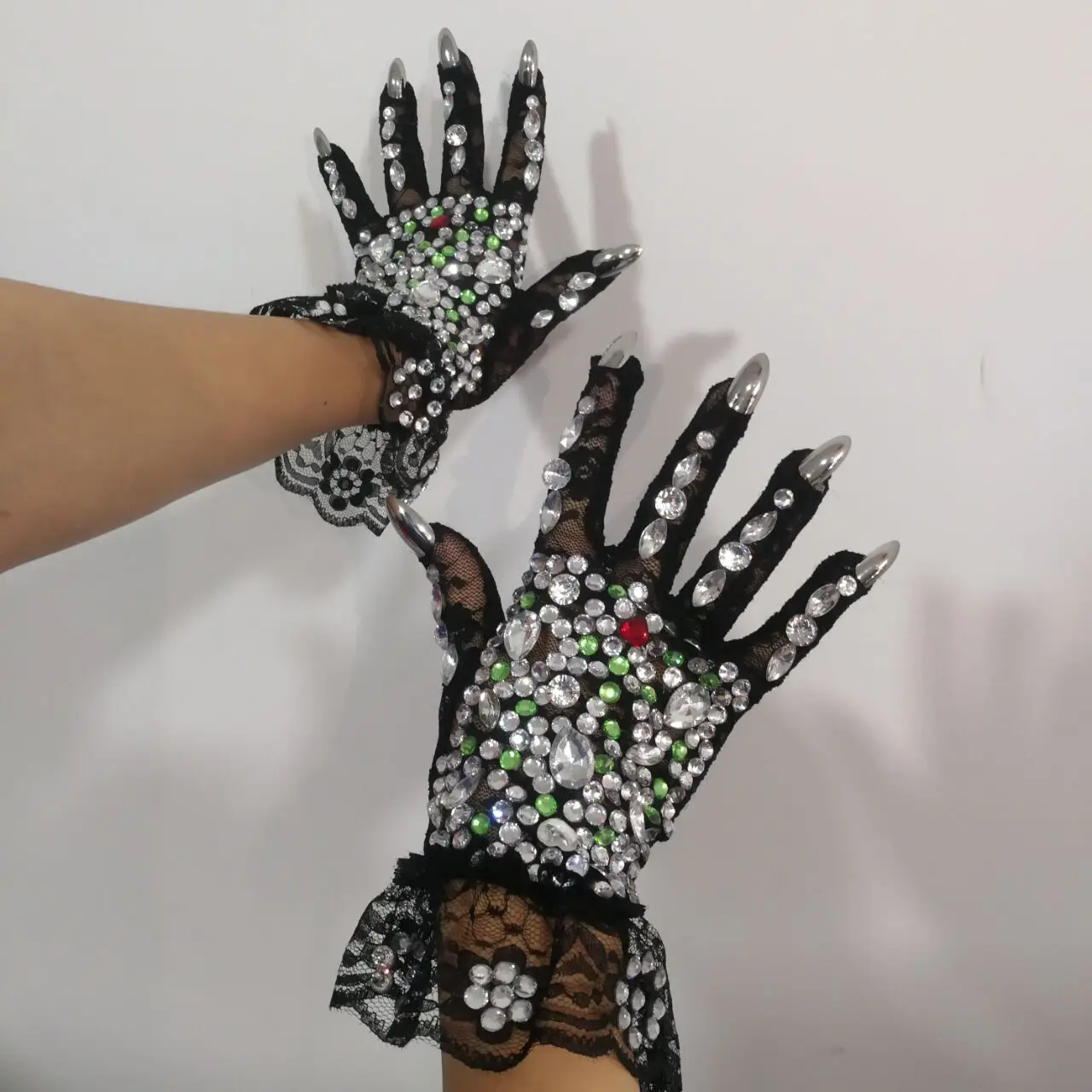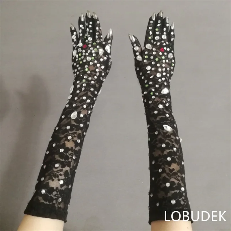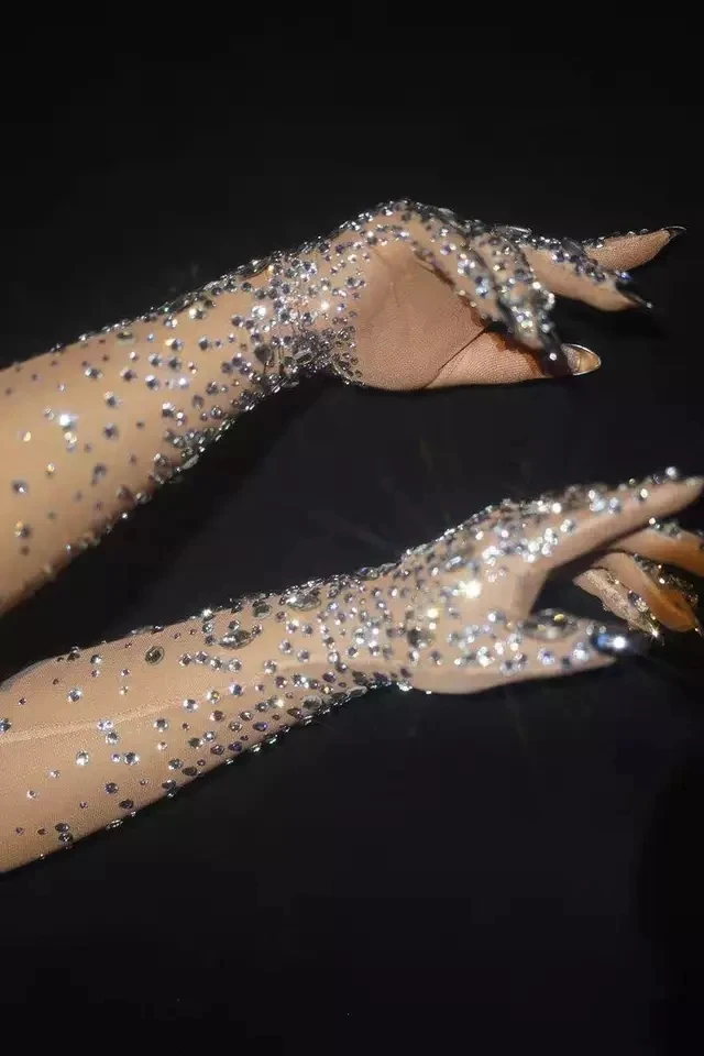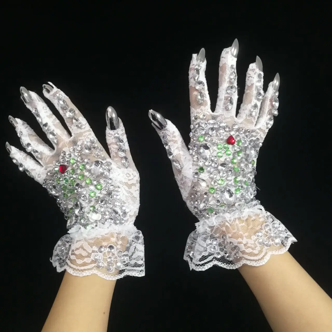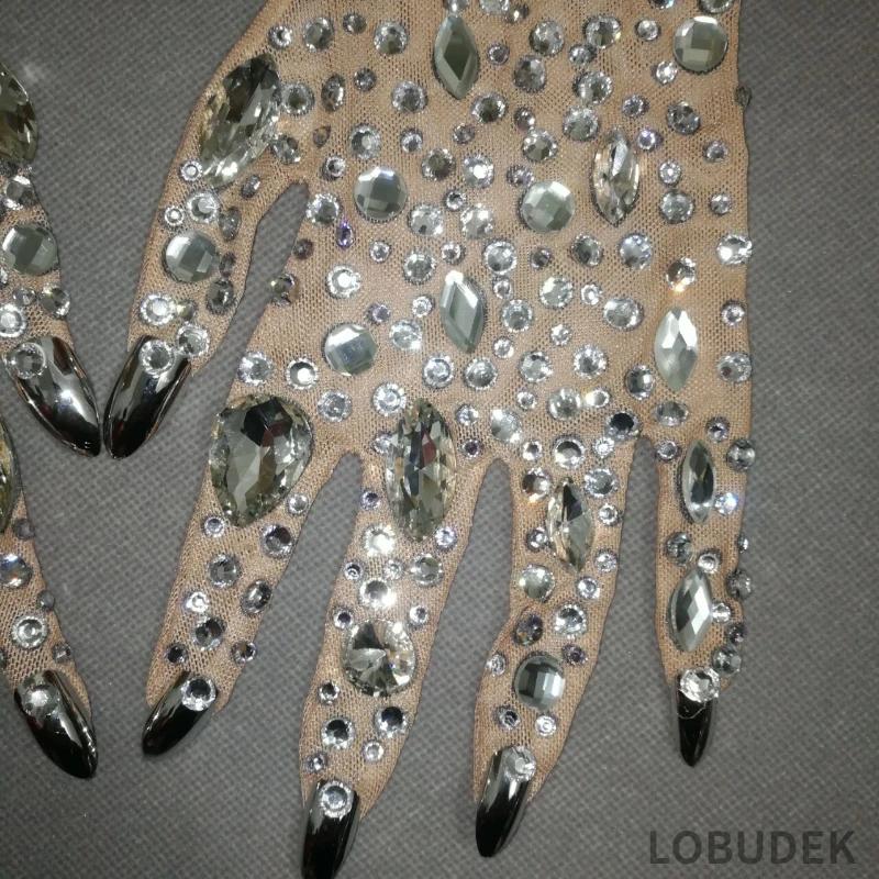 Эластичные прозрачные белые перчатки для Стразы серебристого цвета, украшение для певицы, кристаллы, аксессуары для вечеринок, длинные митенки