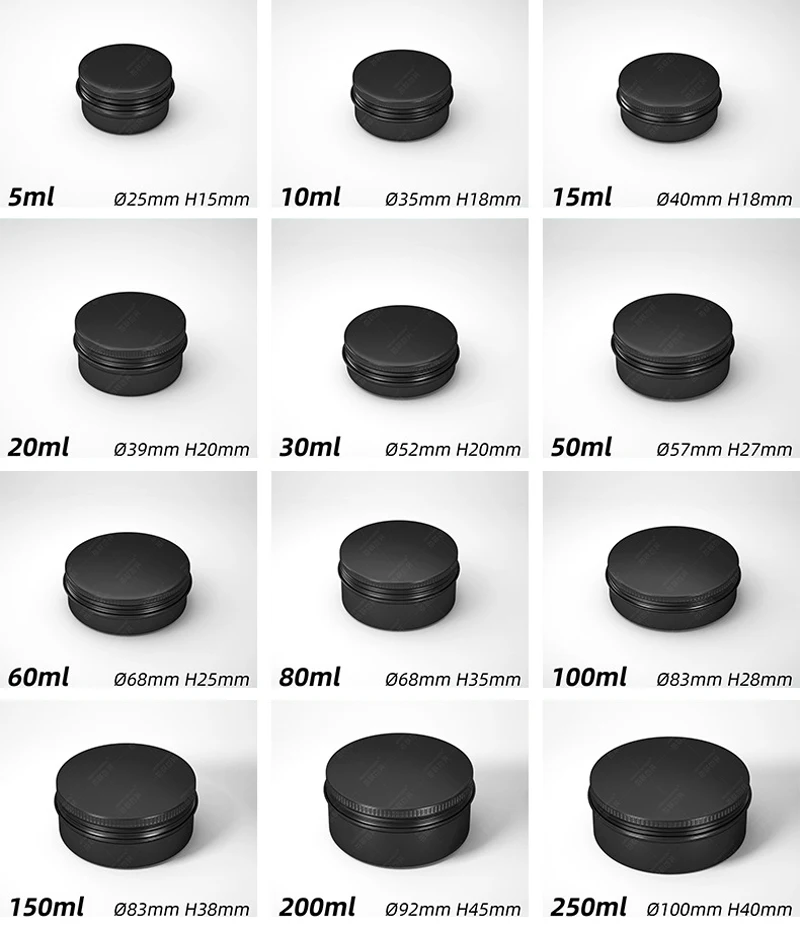 Черные алюминиевые банки, круглые металлические косметические контейнеры с крышкой с закручивающейся крышкой для мазя, порошка, специй или конфет, 48 шт., 10-250 мл