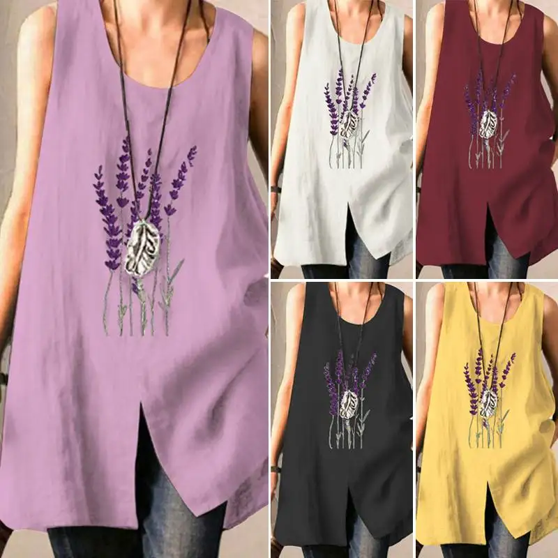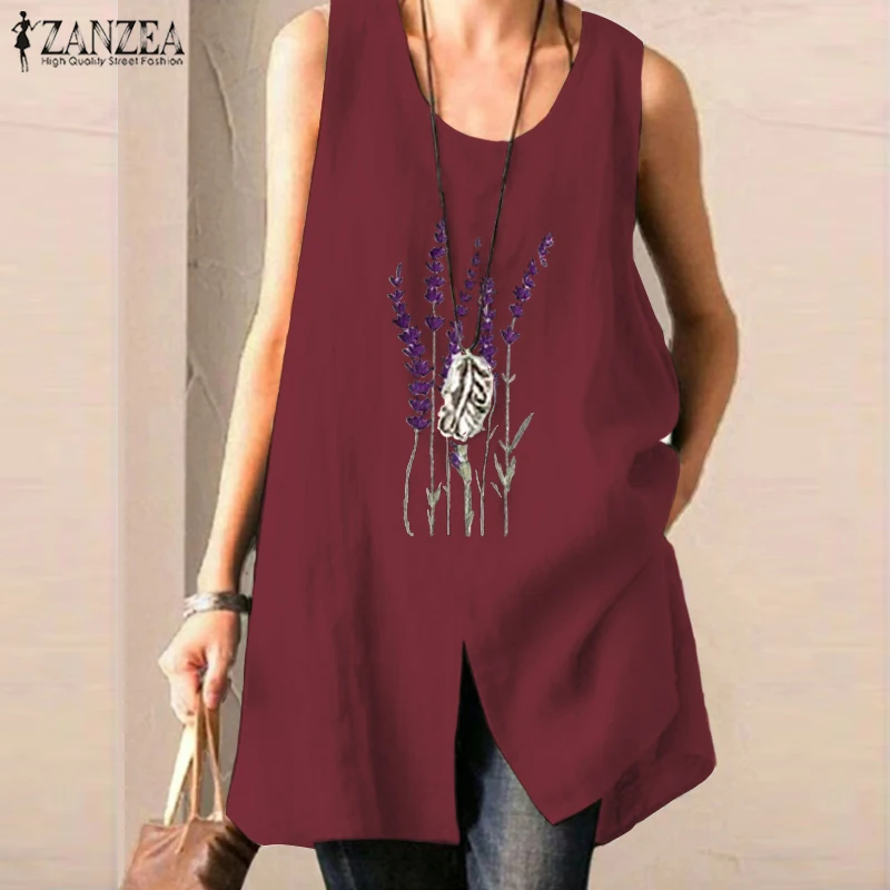 Майка ZANZEA женская с цветочной вышивкой, винтажная Повседневная Блузка без рукавов, блузка с разрезом, Женская туника в стиле оверсайз, лето 2021