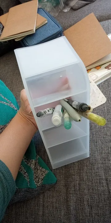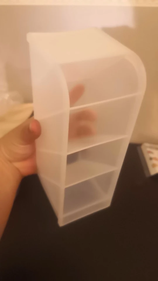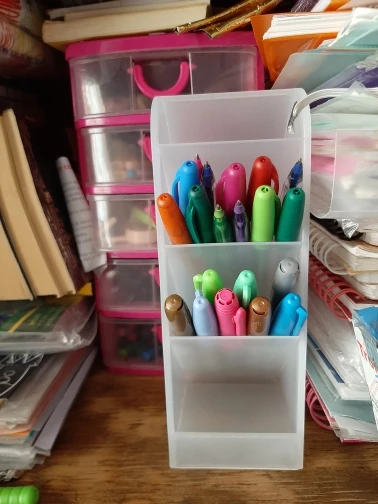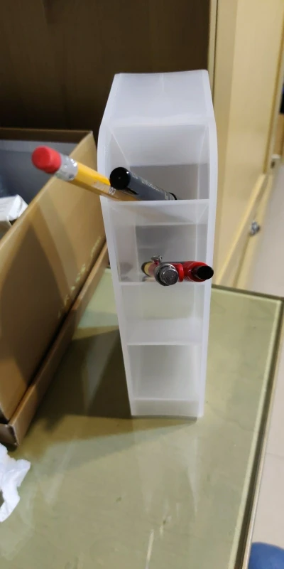 Выглядит точно так же, как на картинке. Я купил 4 отсека 5 см органайзера (тоньше). Подходит для 10-12 тонких маркеров/ручек для каждого отсека. Не занимает слишком много места на моем столе. Доставка была довольно быстрой (доставка из Китая в Канаду занимает около месяца).