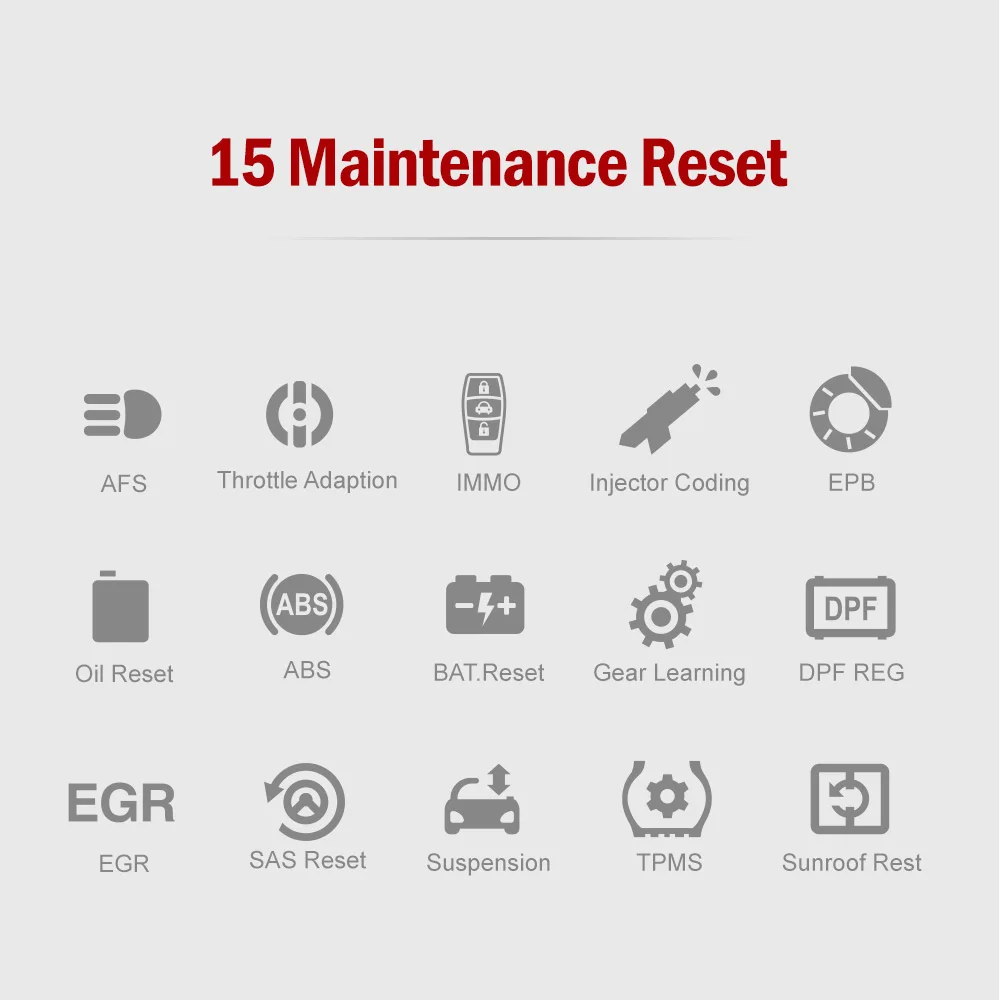 Обслуживание сброса масляной лампы, обслуживание EPB, обслуживание батареи BAT, обслуживание DPF, обслуживание SAS, сервис TPMS, программирование ключей IMMO, кровотечение ABS, сброс солнечной крыши, сброс подвески, сброс передач, сброс коробки передач, AFS сброс фары, Кодирование инжектора, адаптация дроссельной заслонки, передача обучения