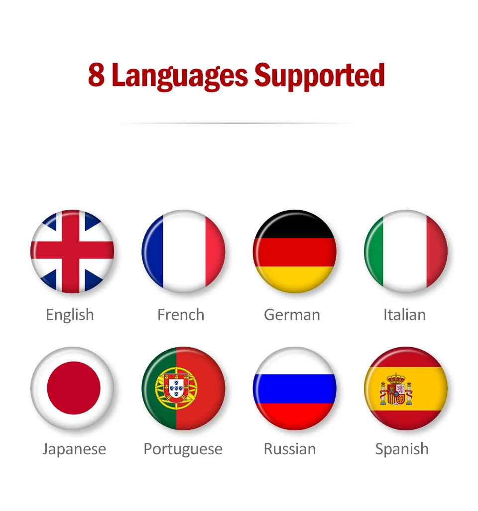 Английский, французский, немецкий, итальянский, японский, португальский, русский, испанский