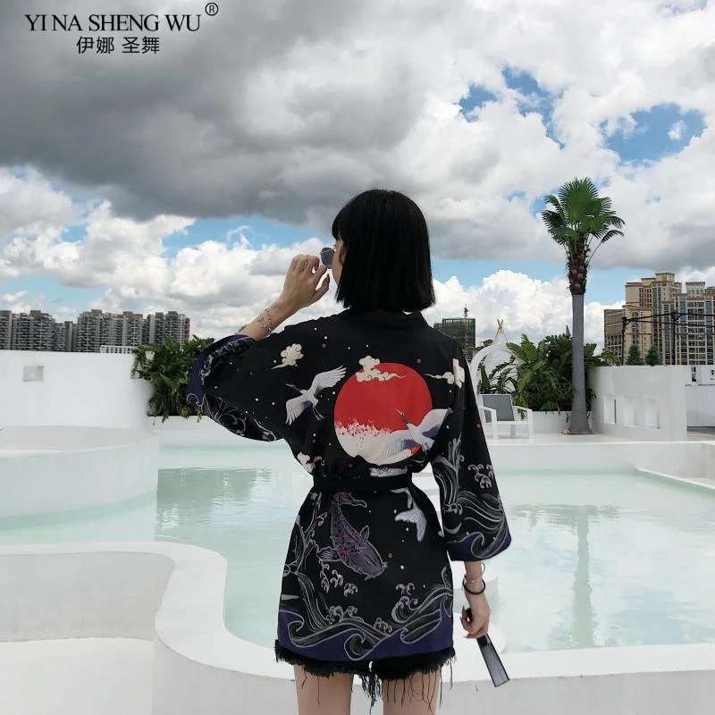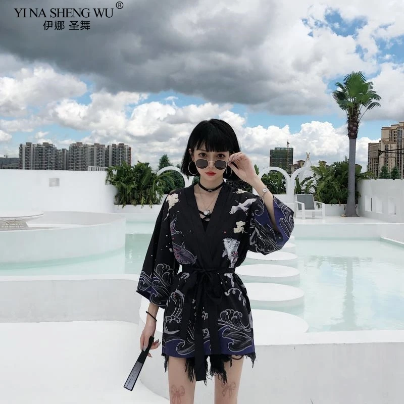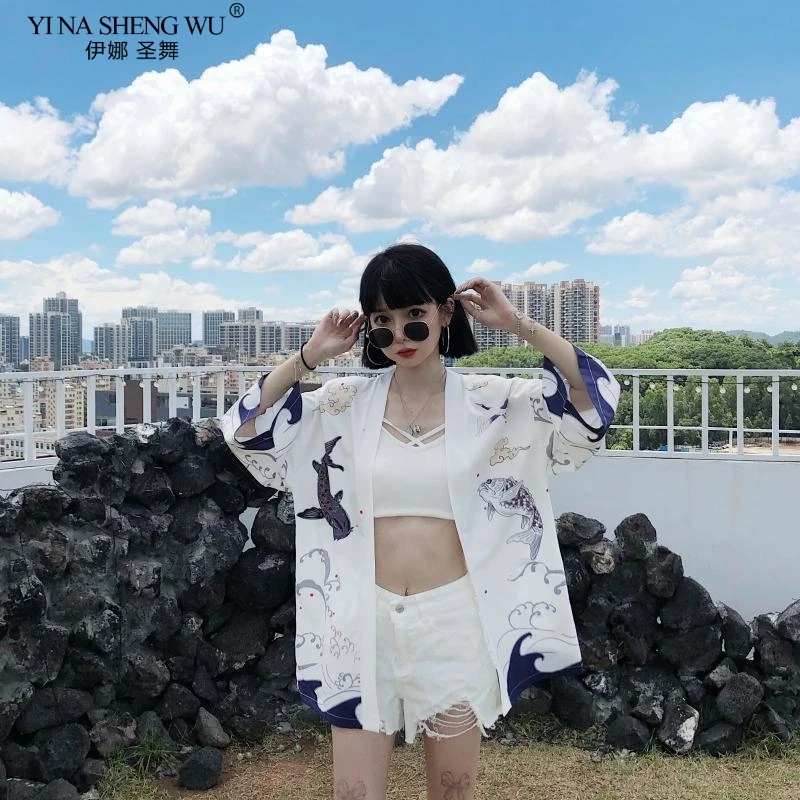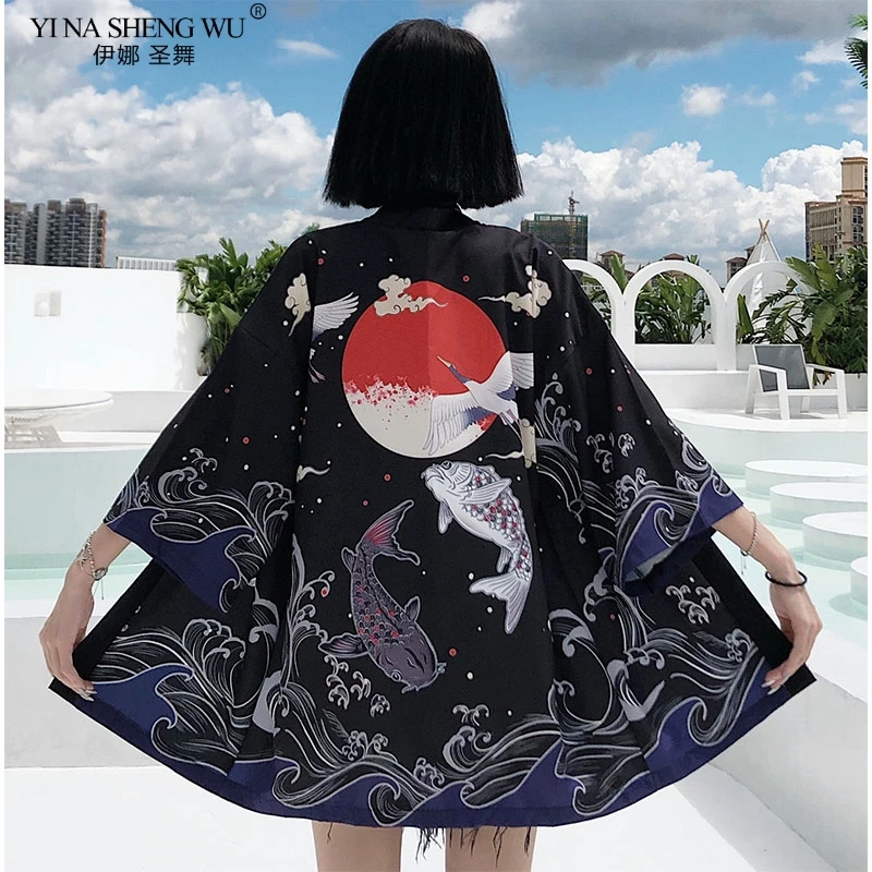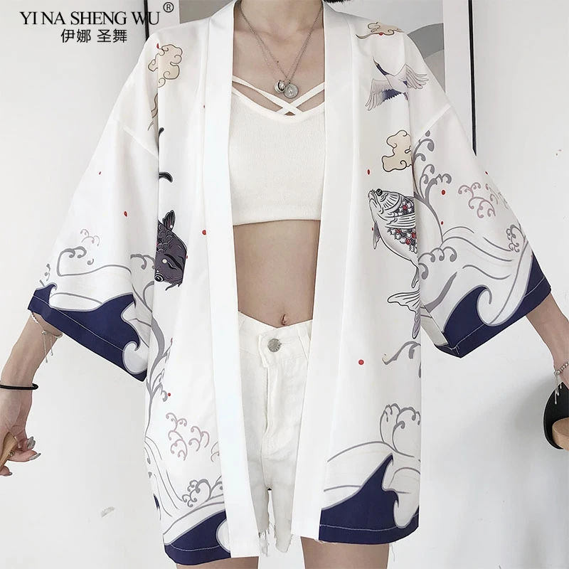 Кимоно женское с принтом рыбы, традиционный кардиган в стиле Харадзюку, юката, уличная одежда с Оби, хаори, Пляжное пальто, в японском стиле