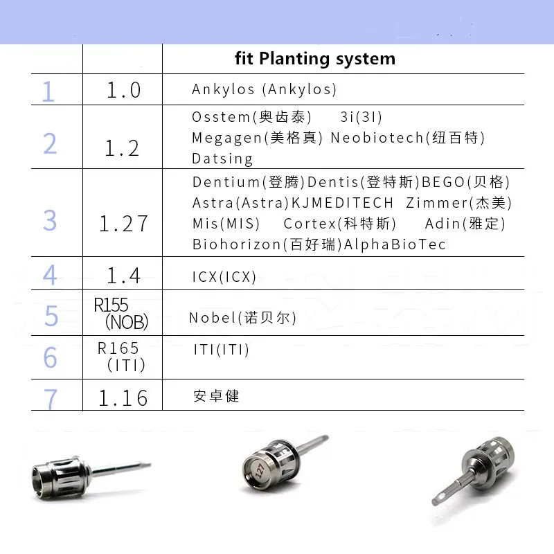 Описание:Динамометрический ключ: 10-70 смДрайверы 1,0 ANK (длинный + короткий) fit AnkylosДрайверы 1,2 3I (длинные + короткие) подходят для 3I,OSS,MEGA ,UFIT,NEO,DATДрайверы 1,27 ден (длинные + короткие) подходят для DEN,BEGO,ZIMMER,AST,KJ,COR,ADIN,ABДрайверы 1,4 ICX (длинные + короткие) подходят для ICXДрайверы NOB (длинные + короткие) подходят для NOBДрайверы ITI (длинный + короткий) fit ITIКороткие задающее устройство: 8,5 ммДлинные задающее устройство: 13,5 ммМедицинская нержавеющая сталь100% Высокое качество135 °C Автоклавный, коробка также может быть стерилизованаКоличество: 1 комплект