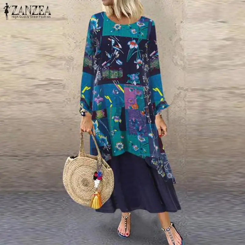 Женский сарафан ZANZEA в стиле ретро с принтом, повседневное вечерние чное Платье макси с длинным рукавом, женское Цветочное платье большого размера, 2021