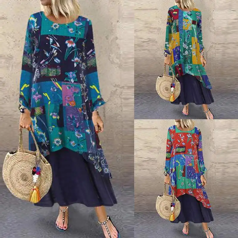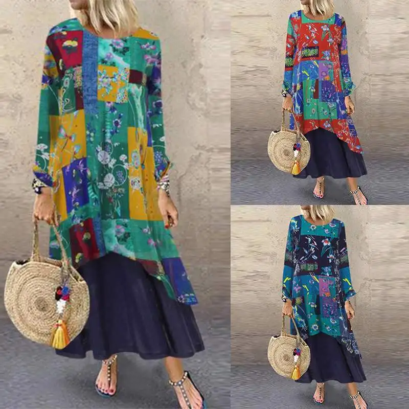 Материал: 65% хлопок + 35% искусственный шелкЦвет: синий, красный, желтыйПосылка включает в себя: 1 платьеИнформация о продукте:-Длинный рукав-О-образный вырез-Повседневные свободные-Многоцветный-Длина по щиколотку-Дизайн в стиле пэчворк-Цветочный принт