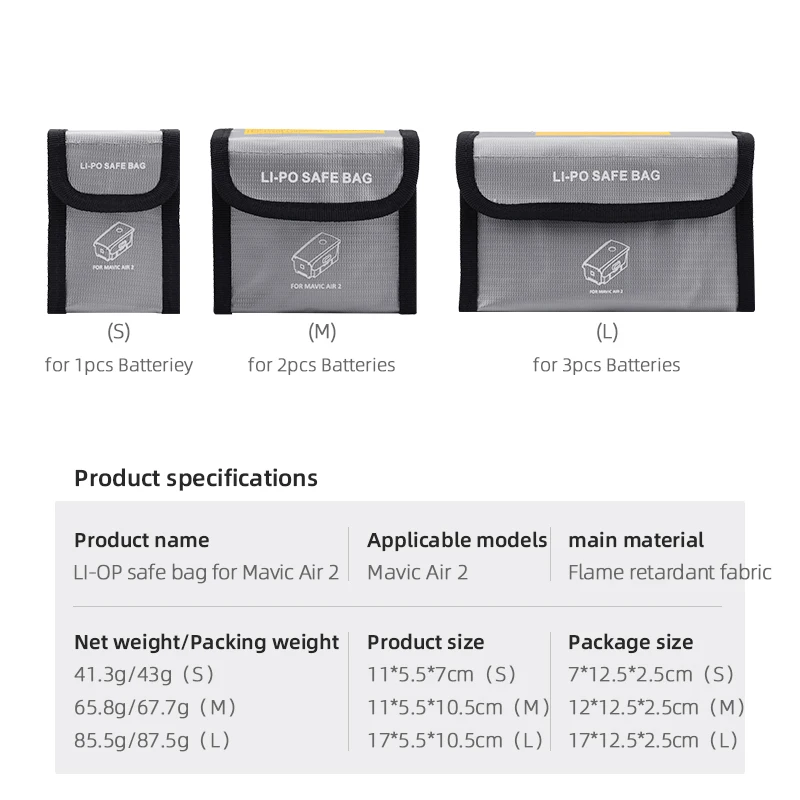 Характеристика:1. Li-Po безопасная сумка для Mavic Air 2/Mavic Air 2S,2. Термостойкость, защита от излучения, взрывостойкость,3. Только безопасная сумка, батарейки в комплект не входят.Описание:Материал: огнестойкий материал s,Применимые модели: для DJI Mavic Air 2/Air 2S,Цвет: черный, серебристый,Вес нетто: 41,3 г (маленький размер для батареи 1 шт.), 65,8 г (средний размер для батарей 2 шт.), 85,5 г (большой размер для батарей 3 шт.),Размер продукта: 11*5,5*7 см (маленький размер), 11*5,5*10,5 см (средний размер), 17*5,5*10,5 см (Большие размеры).Упаковочный лист:1 pc Lipo Безопасный мешокПримечание: аккумулятор дрона не входит в комплект.